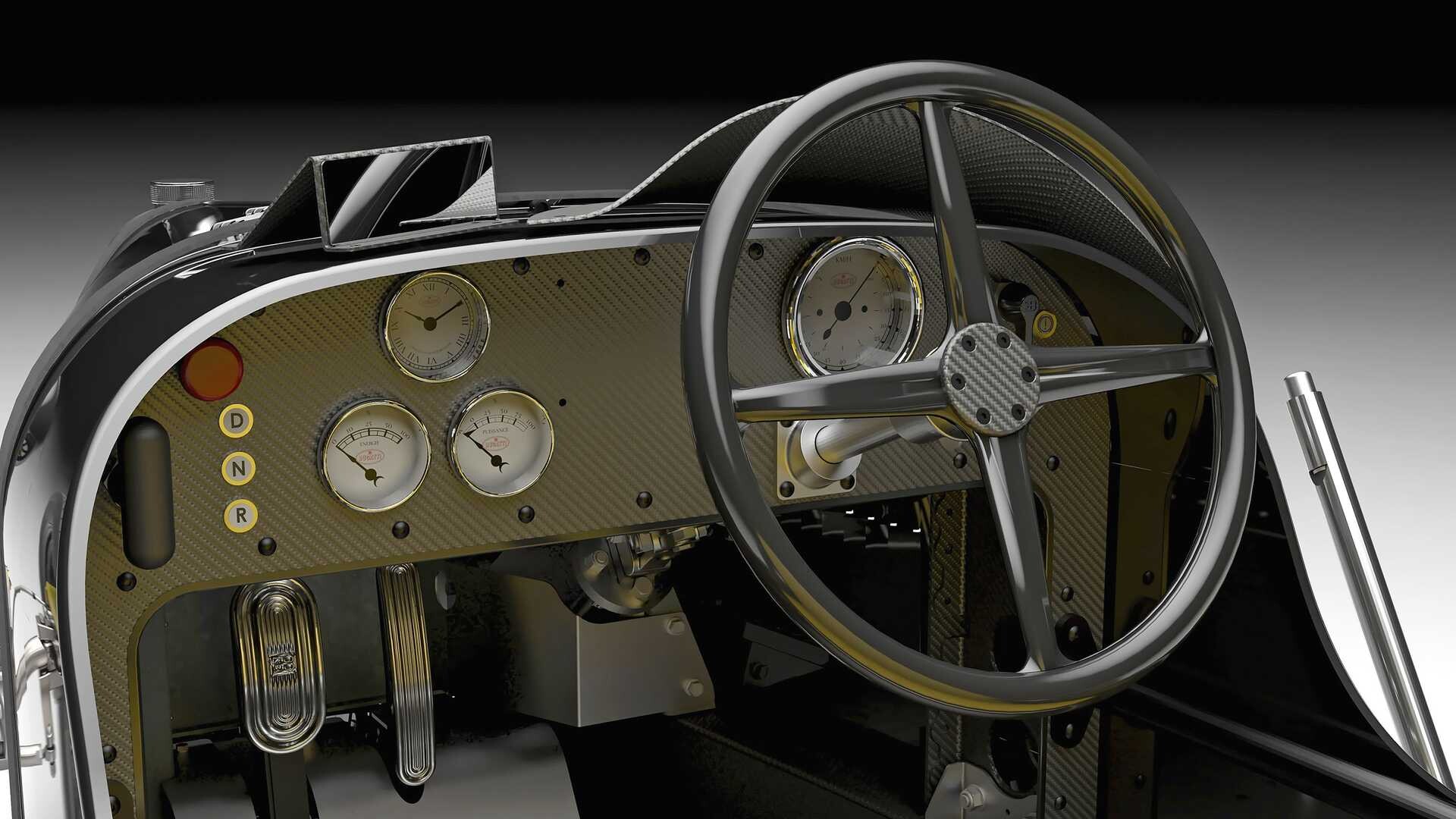 الصورة المرئية لنسخة "الكربون" مطابقة تقريبًا للنسخة الأصلية لسيارة بوجاتي بيبي II. تعرضت مكونات معينة لألياف الكربون ، ولكن بخلاف ذلك يكون اللون أسود. إذا كنت ترغب في إضافة اللمسة الفرنسية للشركة المصنعة للسيارة ، فيمكنك التفكير في العلم الفرنسي المرسوم يدويًا على جانب السيارة. الأضواء المستديرة تعطي انطباعًا رجعيًا ، ولكن خلفها تخفي التكنولوجيا الحديثة في شكل عناصر LED تشبه تلك الموجودة في طراز ميسترال.
