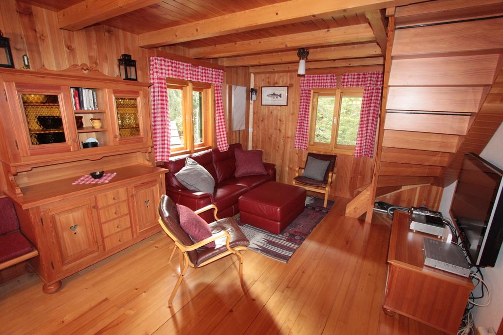 Notranjost je opremljena s svetlim lesom. V pritličju so dneva soba s popolnoma opremljeno kuhnijo, kopalnica, jedilnica in pa železna peč. Stopnišle vodi v nadstropje višje, kjer sta dve spalnici. Vsaka ima po eno zakonsko posteljo in dodatno enojno posteljo. Skupaj je torej prostora za šest ljudi.