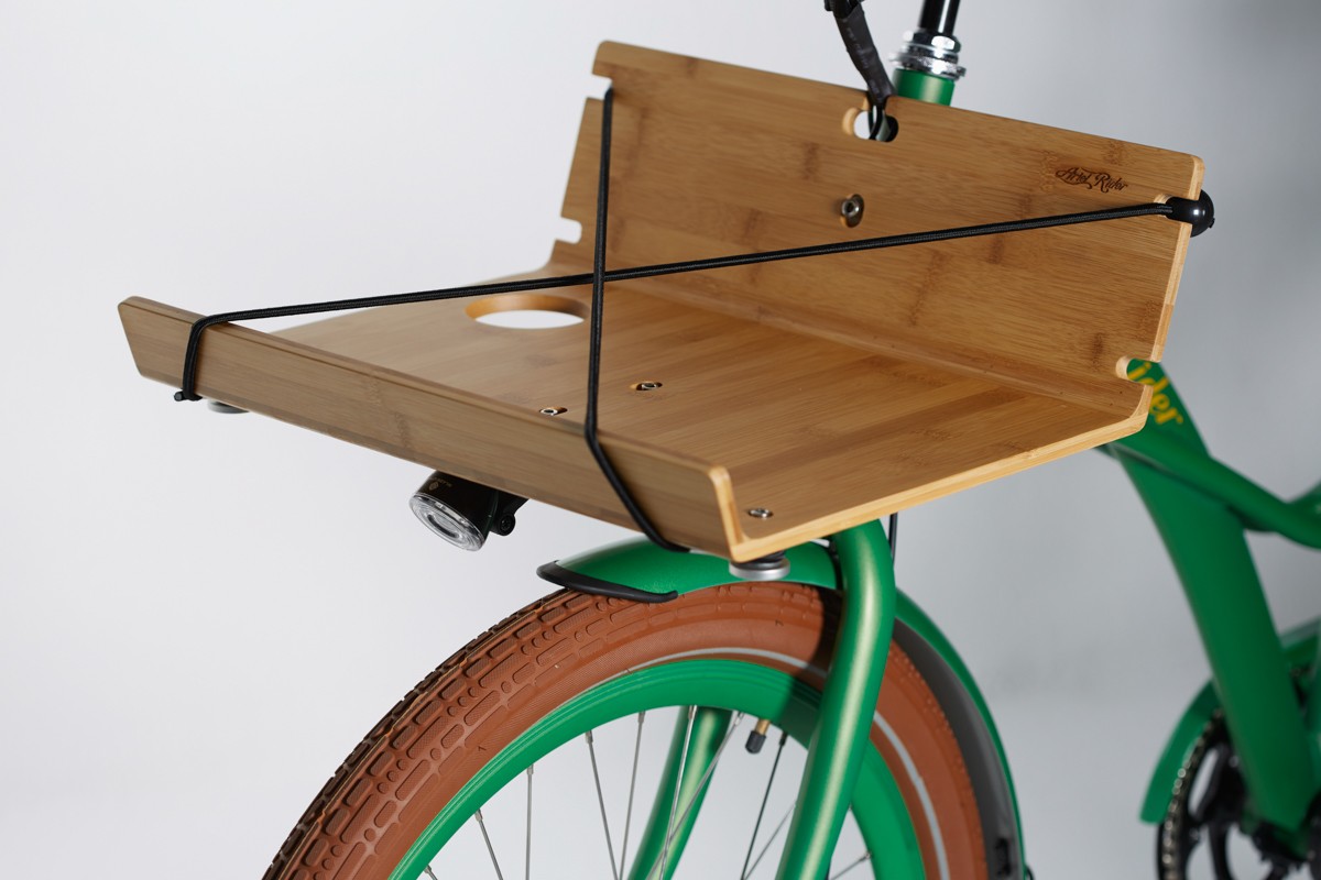 Na prednjem prtljažniku iz bambusa tako lahko prevažate tudi škatlo od pice (stvari zavarujete z elastičnim trakovi), ponaša pa se tudi z držalom za pijačo.