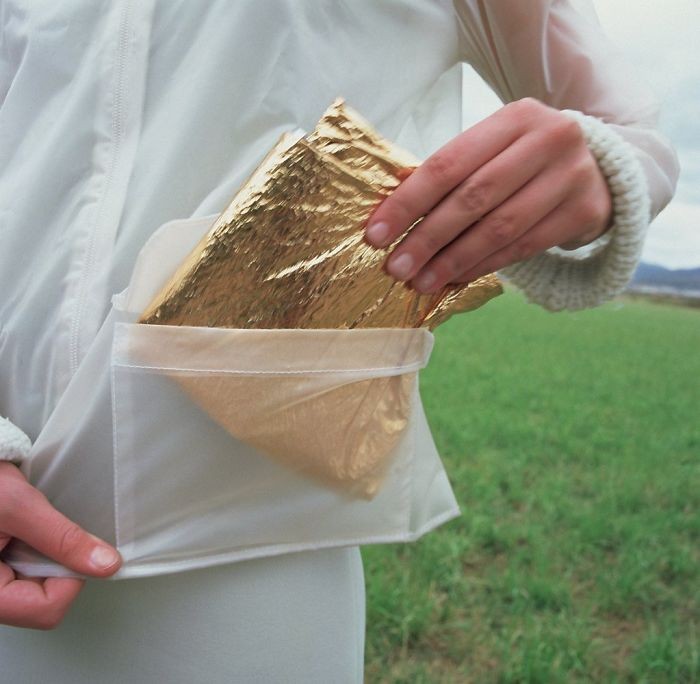 Martin Azua je iz tega materiala izdelal samonapihljivo mobilno hiško Basic House, ki jo lahko pospravite v žep, razširi pa se na velikost, ki nudi udobno in varno zavetje. Izotermična folija ima namreč dvojno funkcijo. Ogreva in hladi. Srebrna stran ščiti pred mrazom, zlata pa pred vročino. Folija v tem primeru odbija žgoče sončne žarke in absorbira telesno toploto, srebrni del pa po drugi strani zaščiti tudi pred vlago.