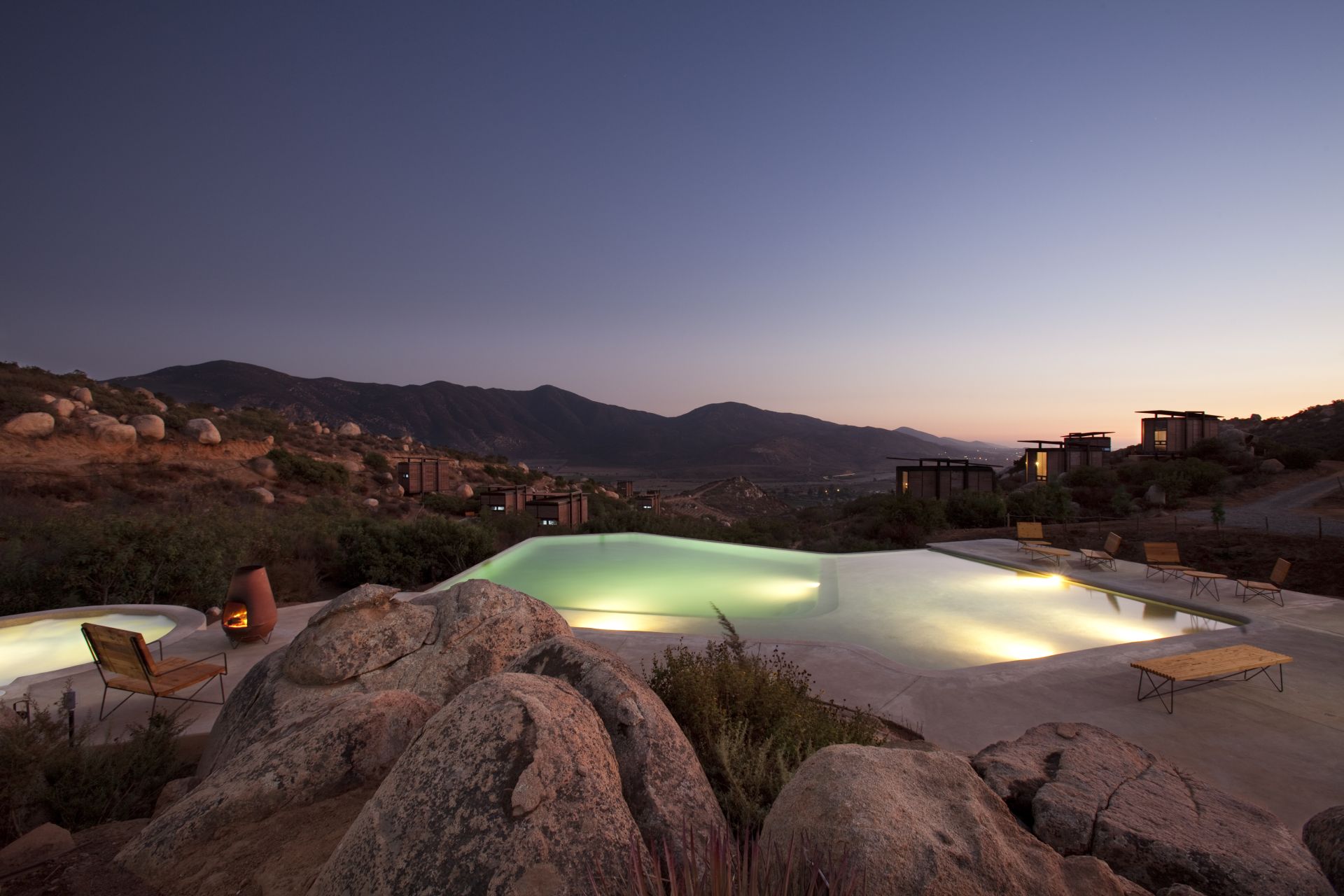 Vsaka soba ima tudi privatno teraso s kaminom, na kateri lahko gostje s kozarcem vina v roki uživajo v prekrasnem razgledu na doline okoli. Ne manjka niti velik bazen in jacuzzi, za zasebnost pa poskrbijo sobe, ki stojijo vsaka zase kot moderne lesene koče.