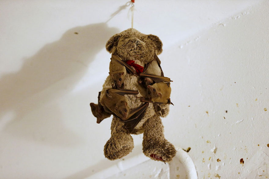 Poškodovani egiptovski sadni netopirji se oklepajo medvedka na domu izraelske ženske Nore Lifschitz, ki skrbi za poškodovane leteče sesalce. 21. februar 2016, Tel Aviv, Izrael.