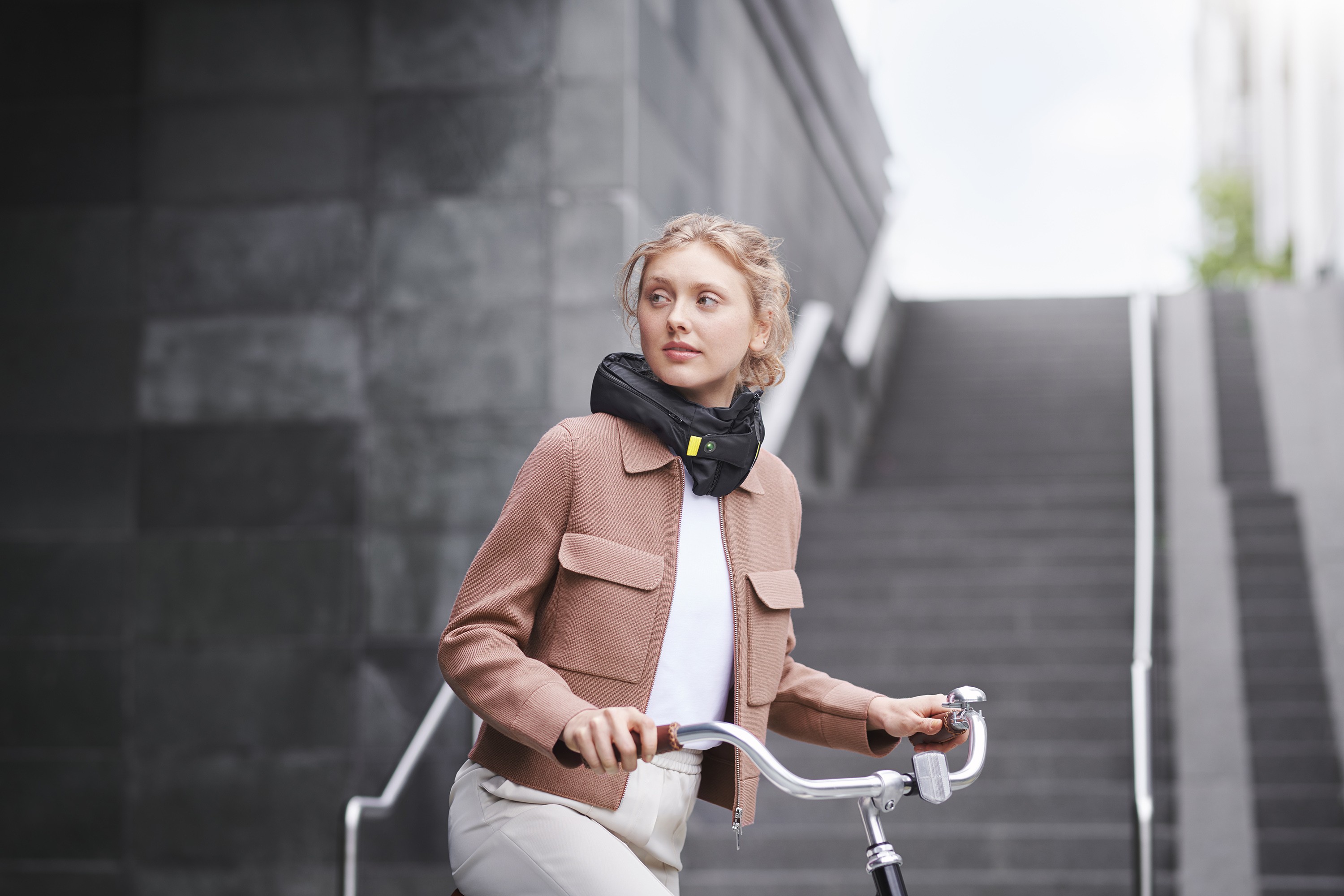 السويدية Hövding je razmišljal nekako tako: če v avtomobilih glavo pred udarci zavaruje zračna blazina, zakaj ne bi imeli zračne blazine tudi kolesarji? Tako je nastal ovratnik Hövding, ki se ob padcu kolesarja v samo 0,1 sekunde napihne v čelado ter tako pred udarcem zavaruje glavo و رقبة.