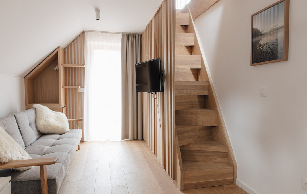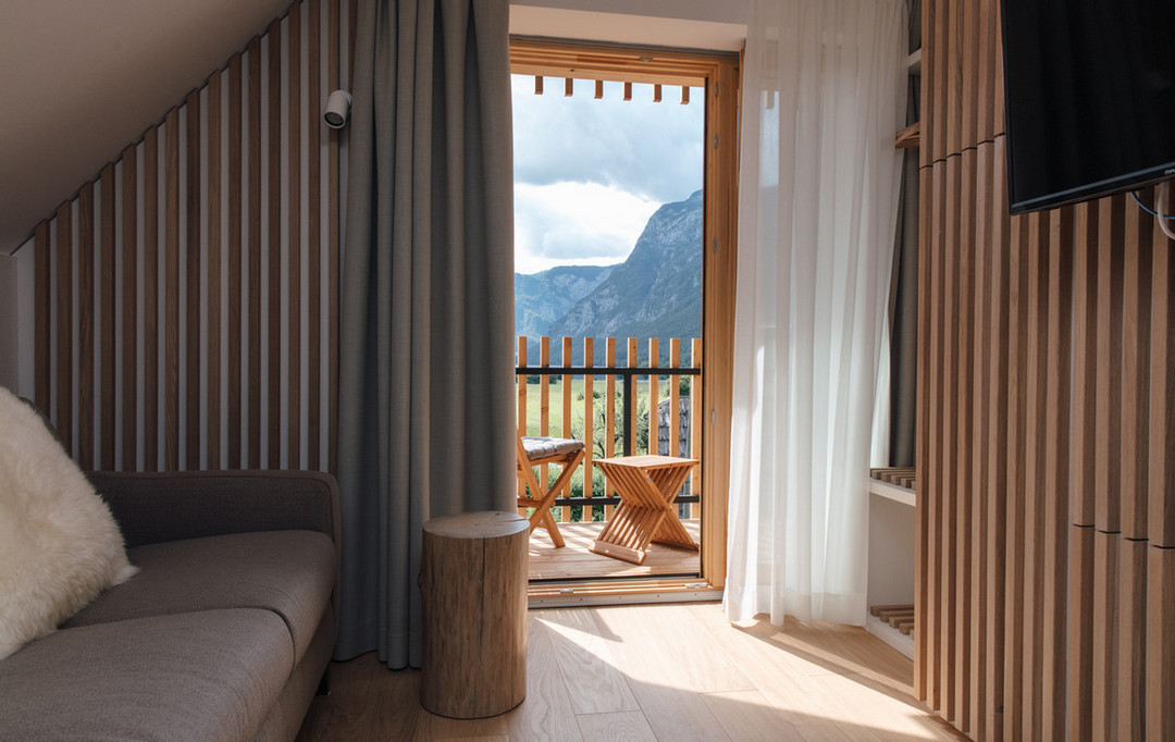 V celotnem hotelu je poudarek na naravnih materialih, zato v notranjosti in zunanjosti prevladuje خشب, ki se popolnoma prilega naravnemu okolju kraja, kjer se nahaja. Prostorne in zračne sobe so urejene minimalistično in moderno, v lesenih detajlih prevladujejo beli in sivi odtenki, za popestritev pa so tukaj pisane tapete z motivi narave. Velika hotelska terasa in balkoni v sobah so še en čudovit dodatek, ki vam omogoča, da uživate v pogledu na naravo med pitjem prve jutranje kave, branjem knjige ali sprostitvijo po celodnevnem raziskovanju okolice.