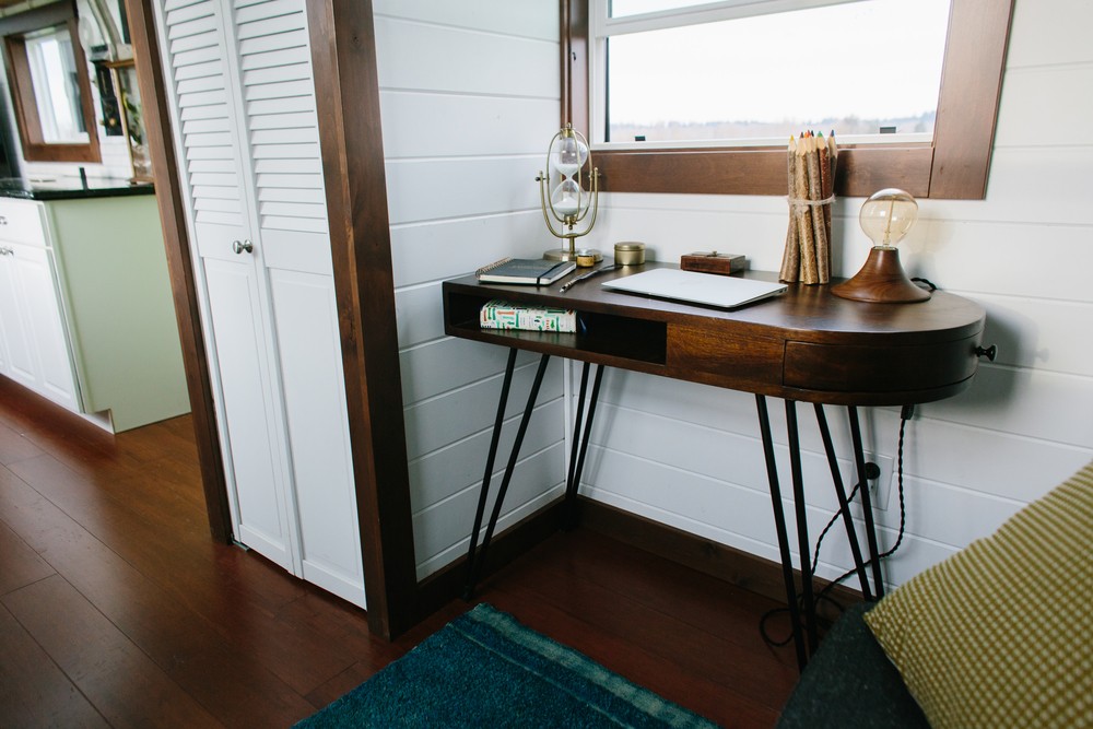 Postelja se v tem mikrodomu izvije izpod mize, s čimer se v domu privarčuje veliko prostora.