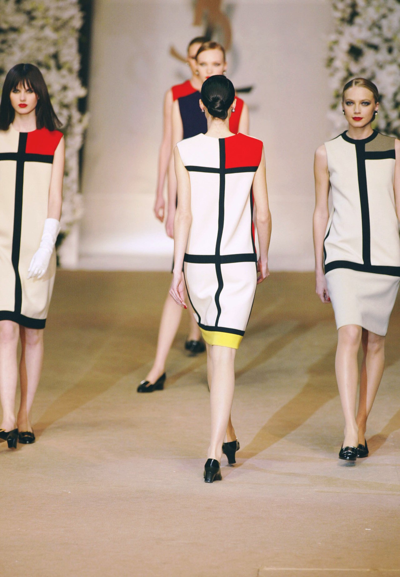 Obdobje reproduciranja Mondrianovih grafik se je začelo leta 1965, ko je Yves Saint Laurent predstavil zelo popularen model obleke, potiskane z Mondrianovim geometrijskim vzorcem. Vendar pa to ni bil prvi pojav njegovih vzorcev v modnem svetu! Mondrian sam je namreč posojal svoja dela za ozadja modnih snemanj in tako je bila njegova estetika ljubiteljem mode do pojava Yves Saint Laurent oblek že dobro poznana.