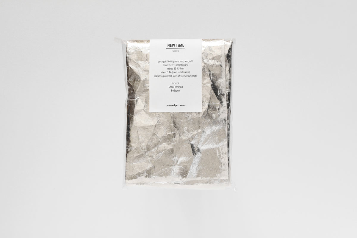 New Time إنها ساعة حائط Veronike Szalaiki, ki jo oblikujemo kot plastelin, njeno ozadje pa spominja na zmečkan papir. Zaradi posebnega materiala iz bombažnih vlaken je namreč zrcalna slika lista papirja, ki pa ga lahko v nedogled mečkate in potem spet ”zlikate”.