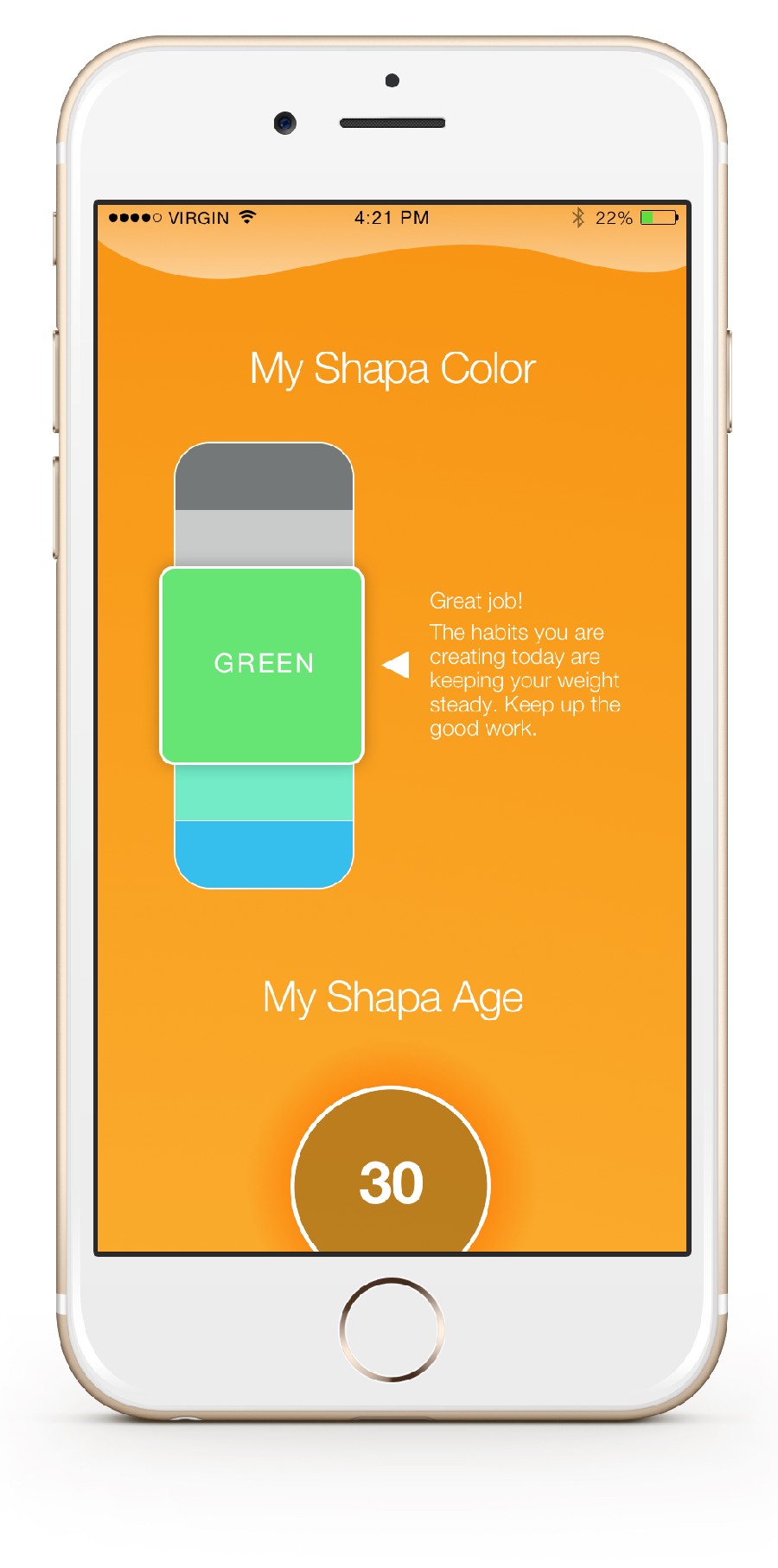 Shapa pri izračunu vaše teže upošteva tudi gostoto kosti و mišično maso, nato pa vam postreže s petstopenjsko barvno lestvico Shapa Color, ki prikazuje stanje vašega telesa. Shapa Age bo izračunala tudi, koliko let šteje vaše telo glede na meritve. Če dobro skrbite zase, potem si lahko mislite, da bo Shapa prikazala kakšno leto manj, kot jih zares štejete.