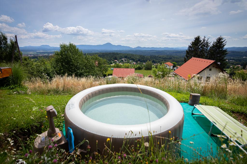 Zunanji prostor koče je razvajanje zase – na voljo vam je velika pokrita zasebna terasa و مطبخ صيفي za pripravo obrokov na svežem zraku. Zvečer lahko v miru z nje opazujete mesto pod vami. Gostom je na voljo tudi velik odprt kamin za uživanje v peki na žaru ter udobno vrtno pohištvo in gugalnica, za idealen oddih ter sproščujoč počitek. Še večje razkošje, osvežitev in polnjenje baterij pa omogoča tudi možnost uporabe masažnega bazena (jacuzzija) v naravnem okolju.