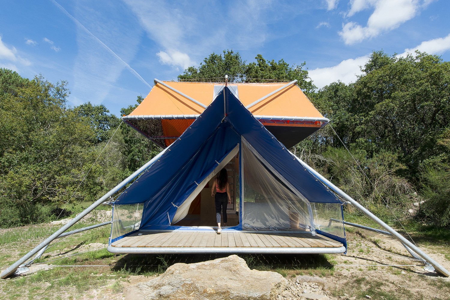 SuperPausée، التي أنشأتها المجموعة الفرنسية Collectif Vous، هي خيمة كبيرة تتكون من خيمتين كنديتين، حيث تم استبدال الهيكل الخشبي بأنابيب فولاذية. إنها قصيدة غير عادية للتخييم تتلاعب برموزها من خلال الهندسة والخفة الواضحة والحد الأدنى من البصمة الكربونية والمنسوجات.
