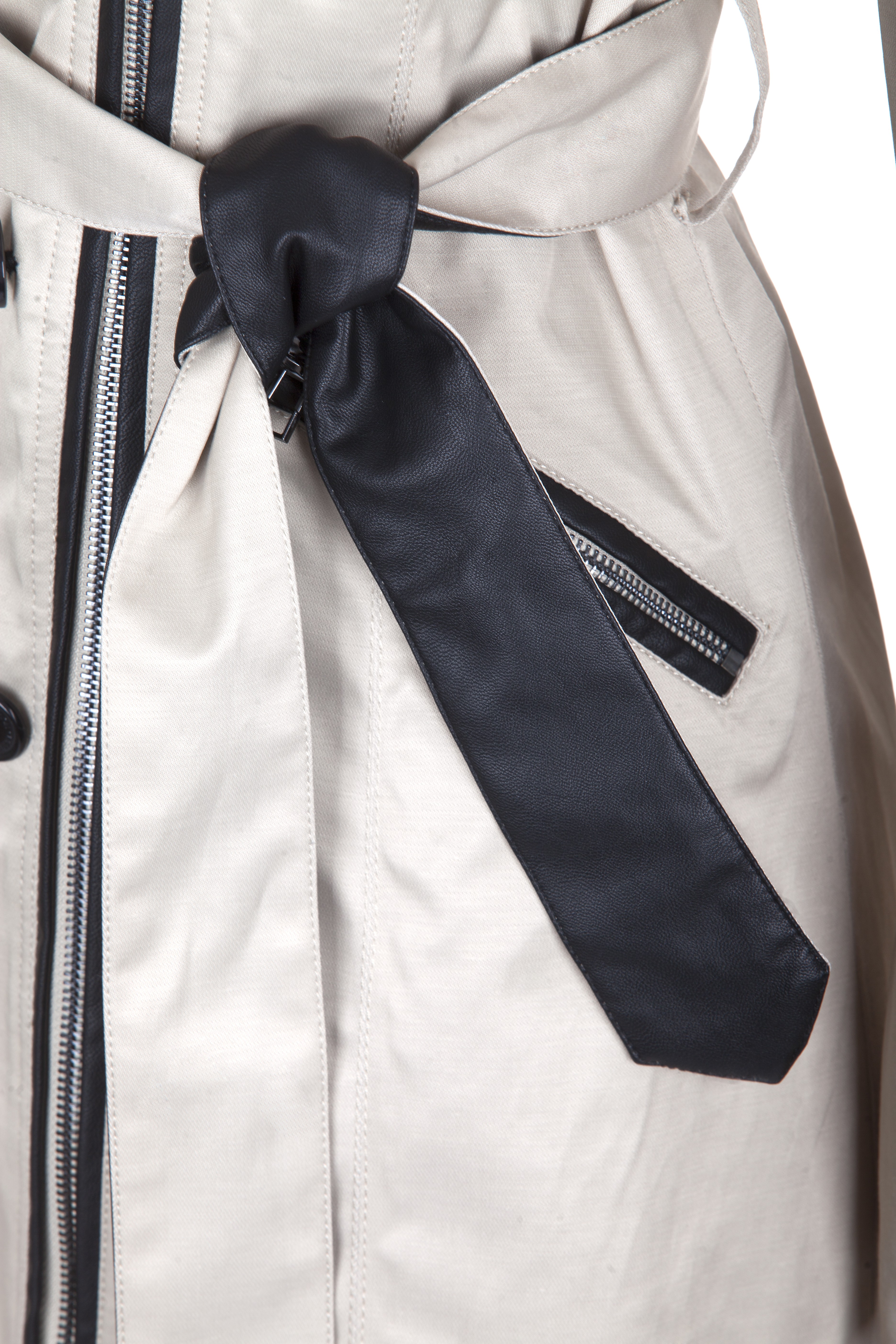 Marxov trenčkot z detajli iz umetnega usnja. Večni kos za ženske, ki spremljamo smernice in se zavedamo, da se modni zakladi skrivajo v detajlih. Pas iz tkanine in umetnega usnja je popolna pika na i trenčkotu. Za drzni videz naj bo naš ovratnik dvignjen, z epoletami pa bomo dale vedeti, da smo pravi modni general.