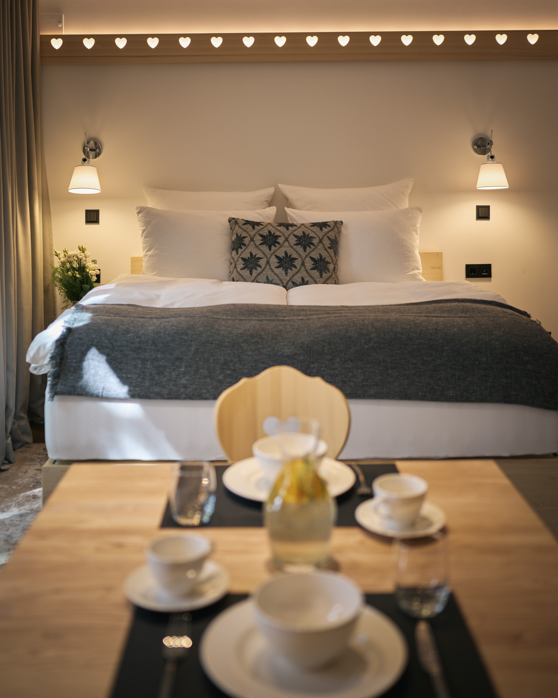 Sodobno opremljene sobe odražajo udobje in toplino. Velik poudarek je na lesu, ki pričara občutek domačnosti in priča o mogočnosti stavbe, ki je z novimi lastniki ponovno dobila ugled, ki si ga zasluži. Med sobami najdete tudi dva dupleksa, s posteljami v galeriji in dve deluxe sobi, ki se lahko pohvalita z veliko kadjo iz katere je mogoče občudovati mogočni Špik.