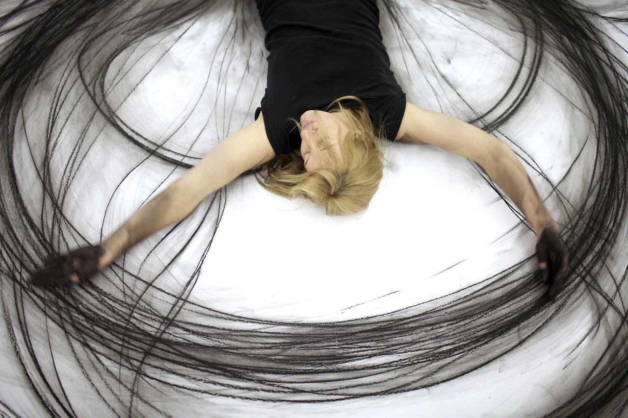 لا تحتاج الفنانة الأمريكية هيذر هانسن إلا إلى قطعة كبيرة من الورق والفحم وجسدها لأعمالها الفنية.