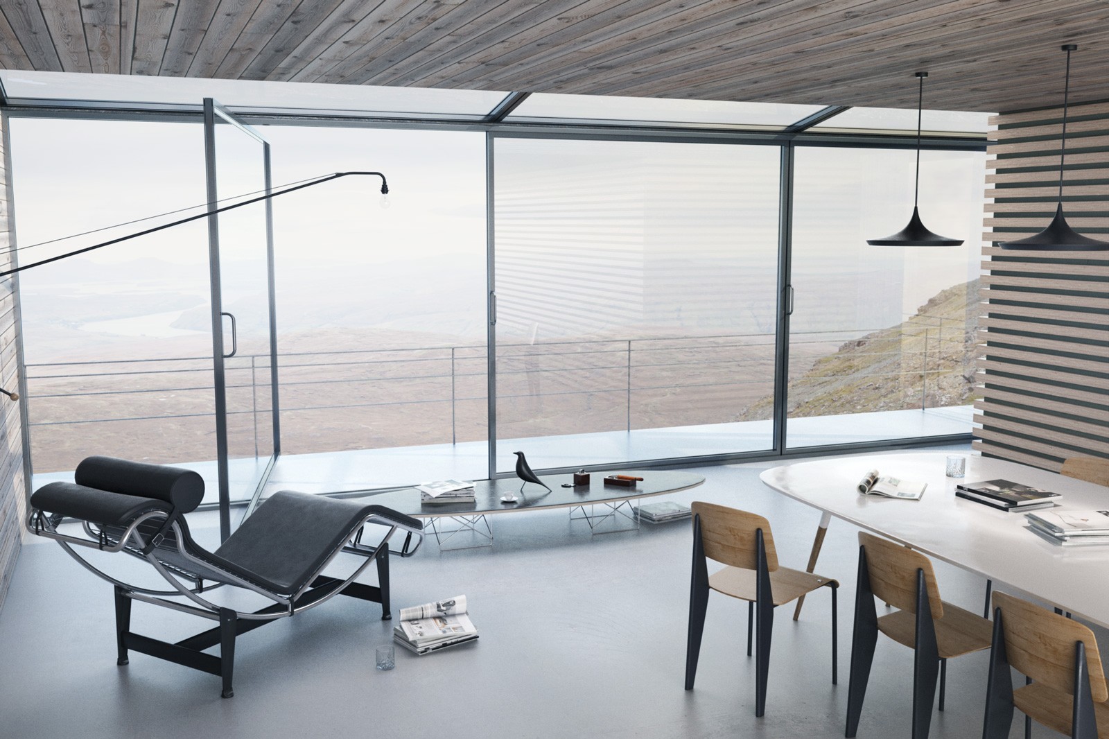 Težko je najti pridevnik, ki bi opisal to super norost francoskega vizualnega umetnika Benoita Challanda, ki je zmiksal vizualni jezik Le Corbusierjevih hiš in skulptur Santiaga Calatrave. Nastala je vizija futuristične samozadostne hišice na hoduljah – morda bi bil boljši izraz ”na kolih”. Kakorkoli, čeprav gre za vizijo, je lokacija hišice, poimenovane Roost House, jasna – na Škotskem bo in to sredi neokrnjene narave.