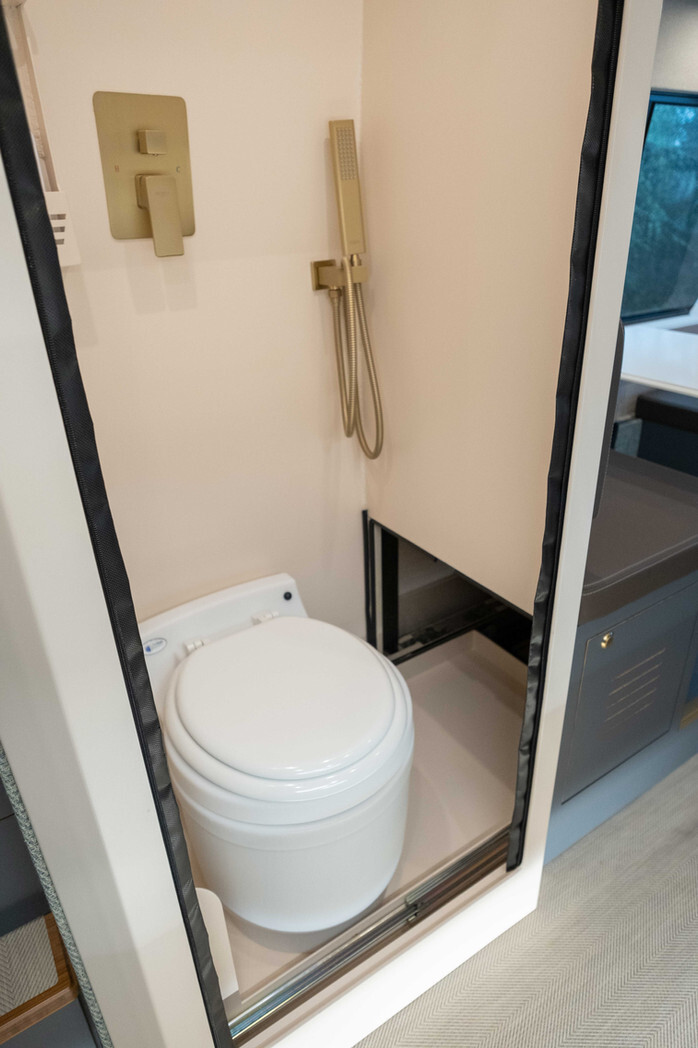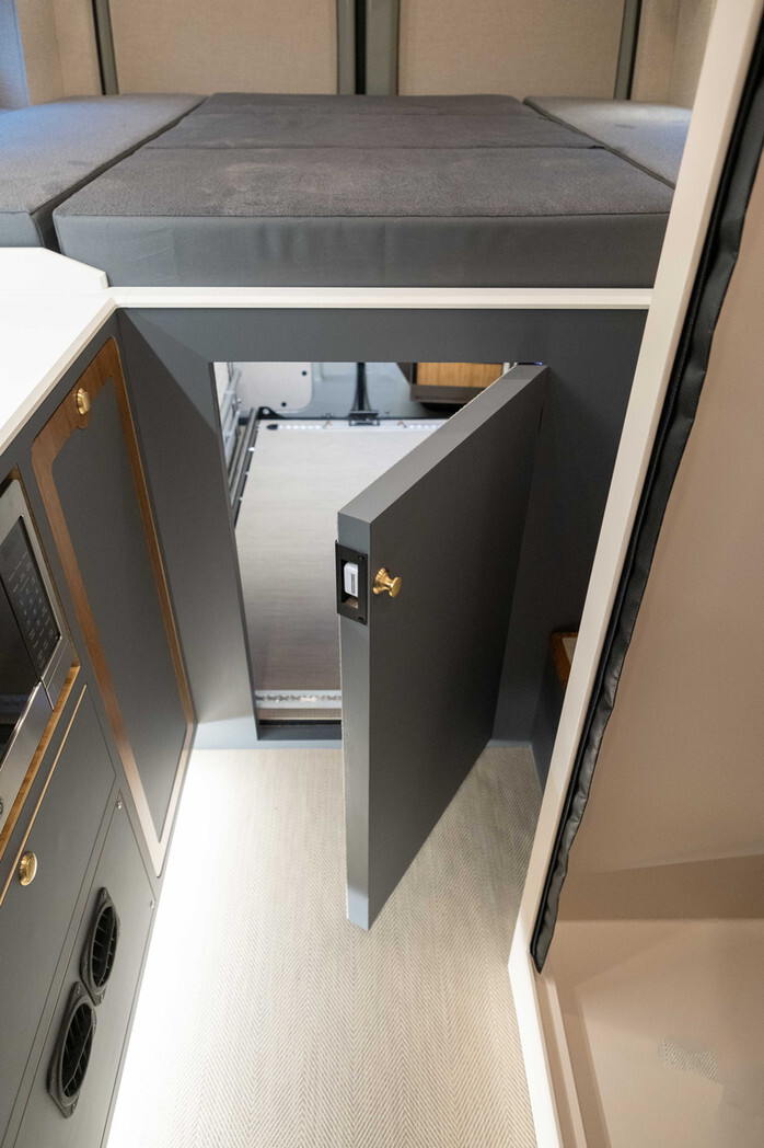 V BAM Vanu je vsak kvadratni centimeter zasnovan z mislijo na udobje in večnamenskost. Od modularne postavitve, ki omogoča prilagajanje prostora številu potnikov in potrebam potovanja, do premišljeno zasnovane kuhinje z dvojnim indukcijskim kuhalnikom, veliko hladilnikom Isotherm 130 in globokim pomivalnim koritom. Ne glede na to, ali pripravljate obrok ali potrebujete dodaten delovni prostor, je vsak element zasnovan tako, da maksimizira uporabnost in udobje. Zanimiva je tudi estetika, ki je zelo v dotiki s trenutkom in trendi. Hvalimo pa tudi nekaj inovativnih detailov, kot je zanimiv stojali za vinske kozarce.