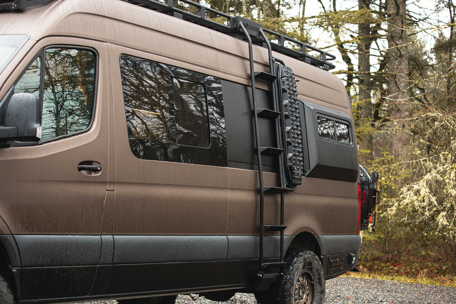 Ob straneh vozila se razteza funkcionalna lestev, ki vodi do prostranega strešnega prtljažnika, opremljenega z več svetilkami Baja Designs, ki osvetlijo vaš tabor ali delovno površino z močjo, primerljivo z dnevnim svetlobom. Strešni prtljažnik ni le praktičen za prevoz dodatne opreme, ampak služi tudi kot opazovalna ploščad, s katere lahko uživate v zvezdnatih nočeh ali jutranjem razgledu.