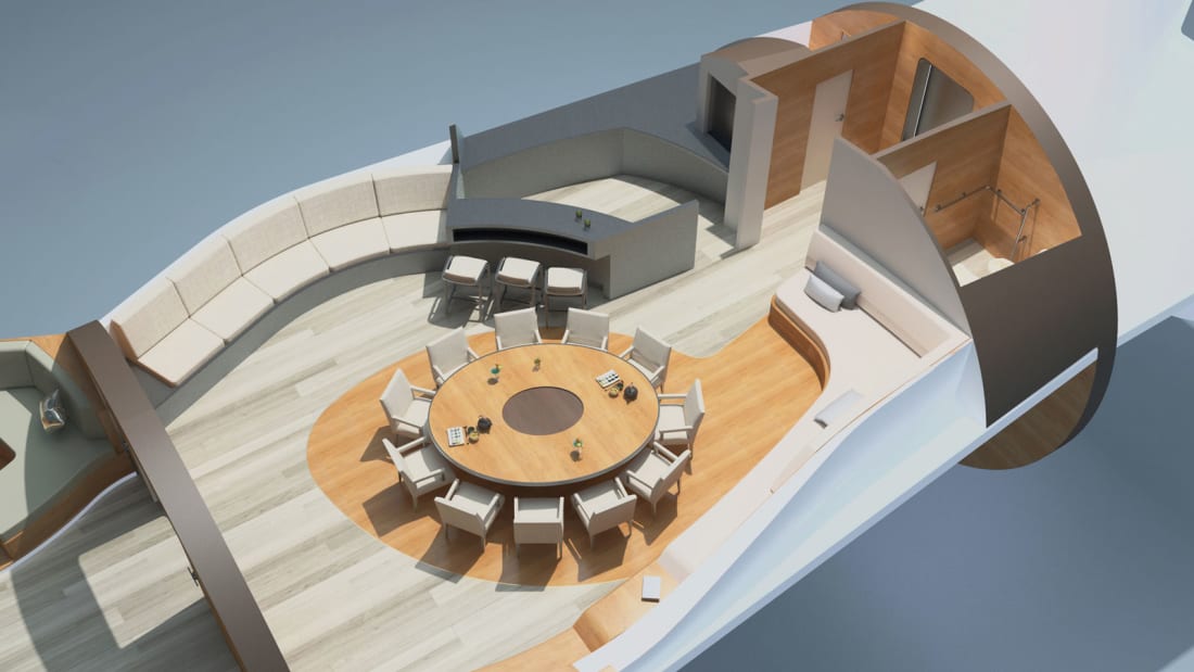 Na Carapace bomo našli tri ‘nadstropja’, na njih pa kabine za goste, kotiček za oddih, wellness center, bar in še kaj. Superjahta bo primerna za zaseben oddih ali za poslovna srečanja, pri katerih je zaželena popolna tajnost. Vprašanje je, ali bo Carapace kdaj le ugledala luč sveta in postala kaj več kot koncept. V tem trenutku tehnologija še ni dovolj razvita za tako obsežen projekt. In tudi če bi bila, bi bila cena takega plovila po vsej verjetnosti na stotine milijonov evrov.