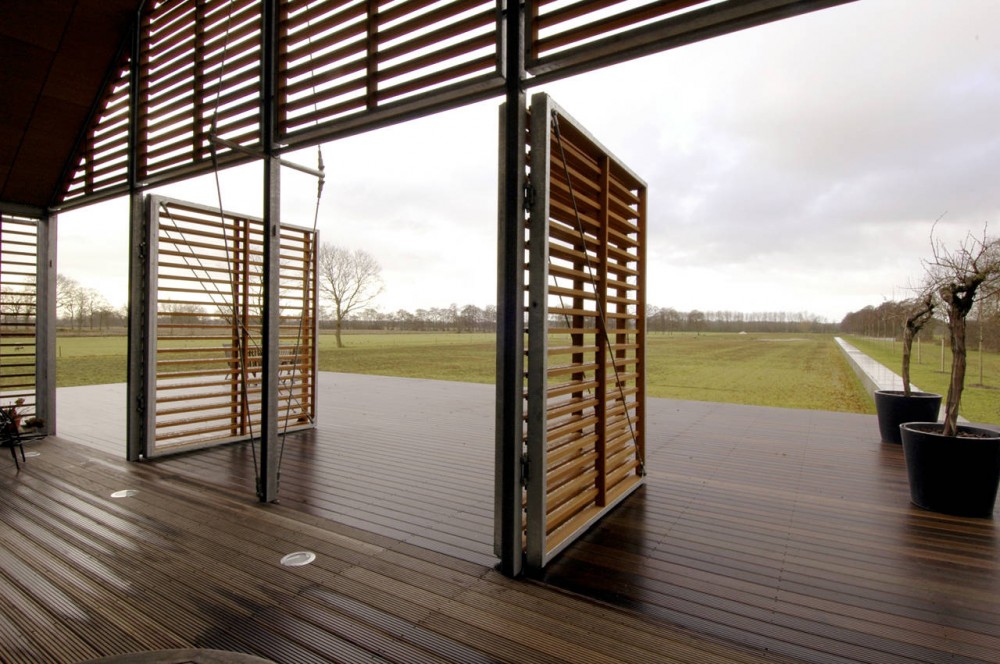 Navrhli dům Kwint Architects a Aatvos, a vychází z typických stodol na venkově. Žaluzie poskytují soukromí v interiéru při zavření a soukromí venku při otevření.