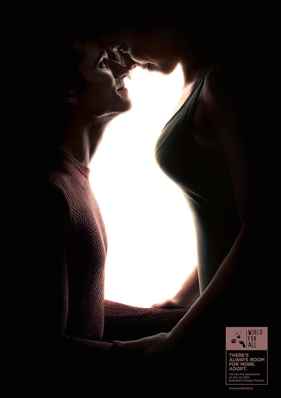 Takže ti lidé přivítal do vašeho domova dalšího mazlíčka, jsou s indickou agenturou Slovo pro všechny připravila vizuální kampaň. A nemohli v tom být brilantnější. Jde o optický klam, které zobrazují lidi v takových pózách, které prázdný prostor mezi nimi vytváří tvar mazlíčka. To zahrnuje jednoduchý, ale silný slogan: Vždy je prostor pro více. Přijmout. (Vždy je místo pro jednoho navíc. Přijměte.)