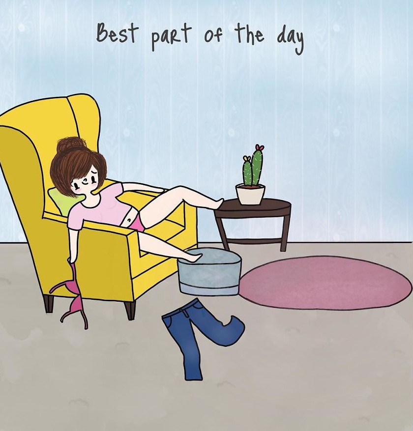 Nejlepší část dne ženy je, když se vrátí domů, svlékne si přiléhavou podprsenku, tričko a těsné kalhoty a volně leží na posteli. Zní vám tato scéna povědomě? Ilustrátorka Akshara Ashok zachytila ve svých komiksech mnohem více takových situací, se kterými se jistě ztotožníte.