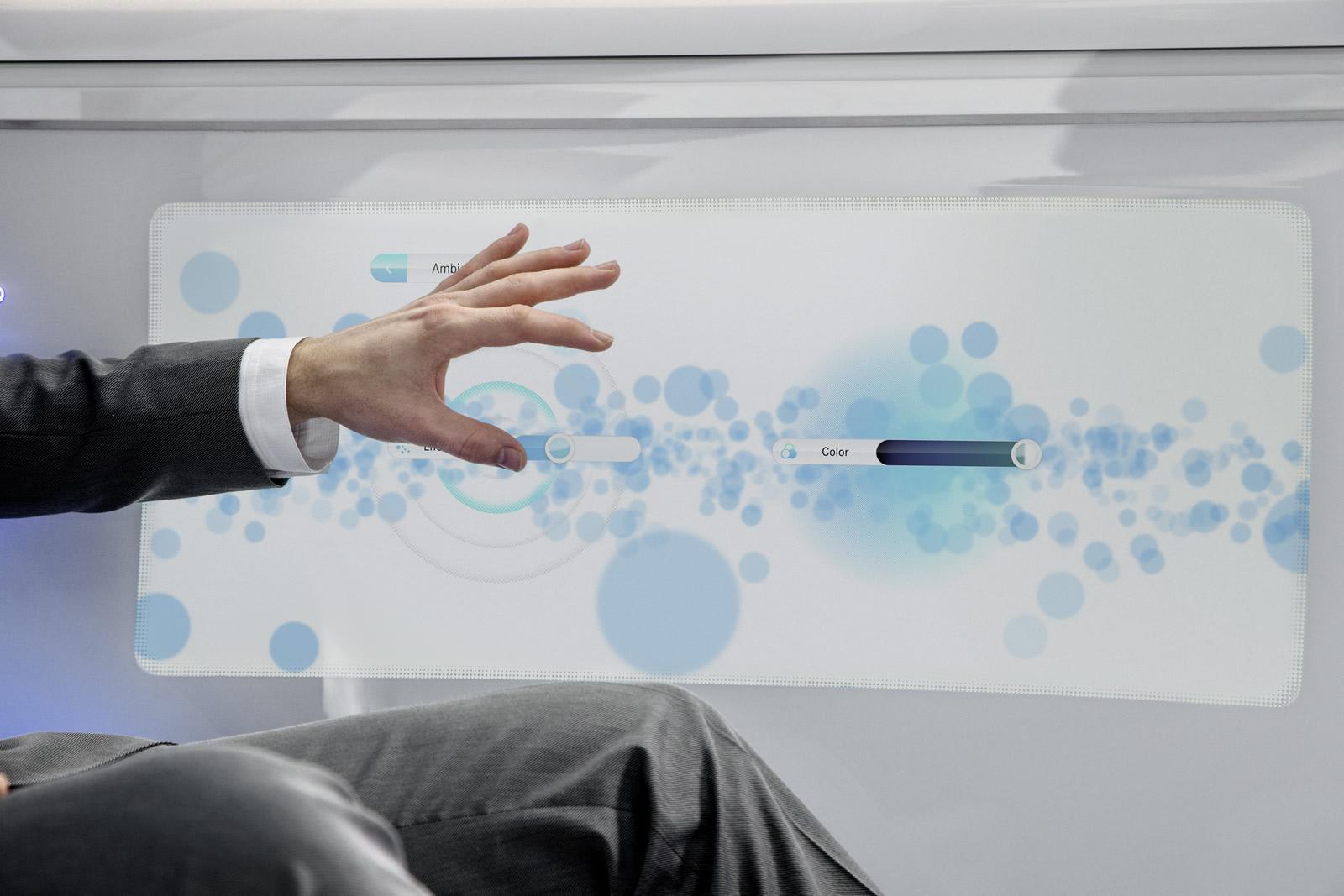 Pod futuristickou skořápkou s interaktivními Led světla, které při ovládání řidičem a bíle svítí modrý, kdy je zapnutý autopilot a které slouží ke komunikaci s ostatními vozidly a chodci, jsou skryté čtyři libovolně se otáčející samostatná sedadla a šest velkých displejů citlivých na dotyk, gesta a pohyb očí s vysokým rozlišením.