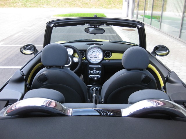 Glavna aduta testnega minija sta zagotovo platnena streha oziroma dejstvo, da jo lahko z enostavnim pritiskom na gumb – ki ga moramo sicer držati pritisnjenega skozi celotni proces odpiranja oziroma zapiranja strehe – odpremo in se naužijemo sončnih žarkov (pa ne pozabimo na kremo z visokim zaščitnim faktorjem), in gokart občutek za minijevim volanom. Ta občutek je še intenzivnejši, če pritisnemo gumb z napisom »SPORT«, ki se nahaja v bližini prestavne ročice 6-stopenjskega menjalnika. Takrat elektronika poskrbi, da je pedal za plin še odzivnejši in volan še neposrednejši kot sicer. Kot smo že zapisali, je imel testni mini ročno klimatsko napravo, kar pa nas niti ni motilo, saj je njeno nastavljanje enostavno. Omenimo še, da lahko minijevo platneno streho odpremo le toliko, da deluje kot pomična sončna streha, kakršno poznamo v »običajnih« avtomobilih. Pa še to, streho lahko odpiramo in zapiramo tudi med počasno vožnjo – največ 30 km/h.