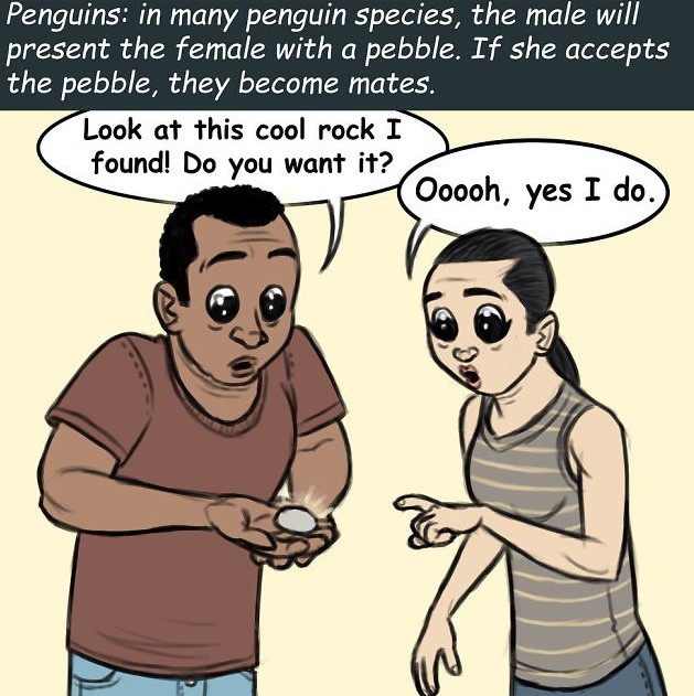 Umělec Ben Hed vytvořil zábavná komiksová série, který ukazuje, jak Lidé flirtují jako tučňáci, želvy, pavouci ... Ben žije v domě s tři psi, dvě kočky, 15 kuřat a pět koz, takže není divu, že s nápadem přišel zvířecí flirtování v lidské kůžiSmích je zaručeno!