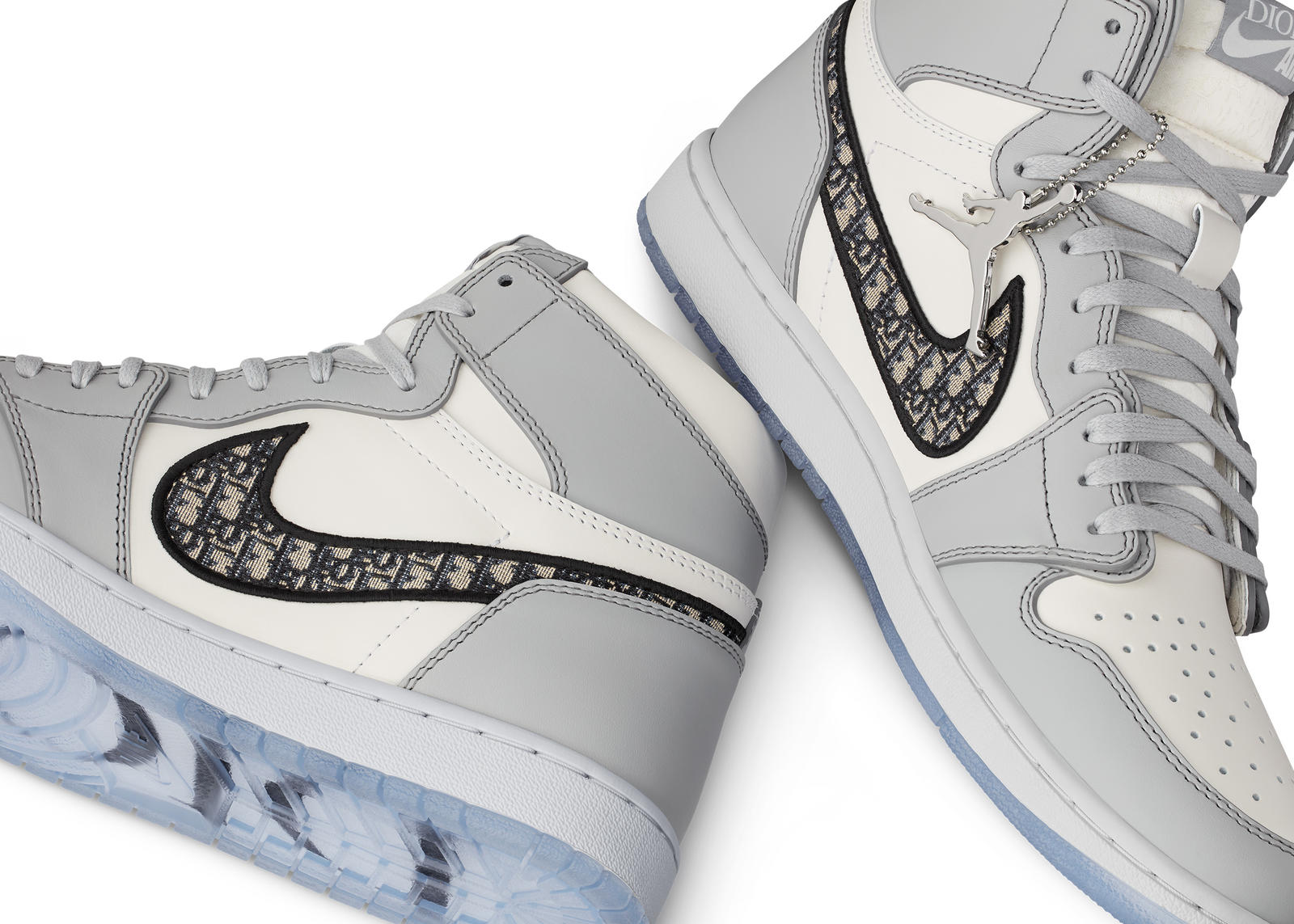 Dior x Air Jordan 1 High OG jsou vlastně klasické šedo-bílé tenisky Nike Air Jordans, jen jsou tentokrát vyrobeny z jemné italské kůže a zdobeny „brandingem“ Dior. Logo značky se objevuje ve slavné šipce Nike a nad ním je znak Air Dior, která je i na levé podrážce, zatímco pravá má nápis Dior.