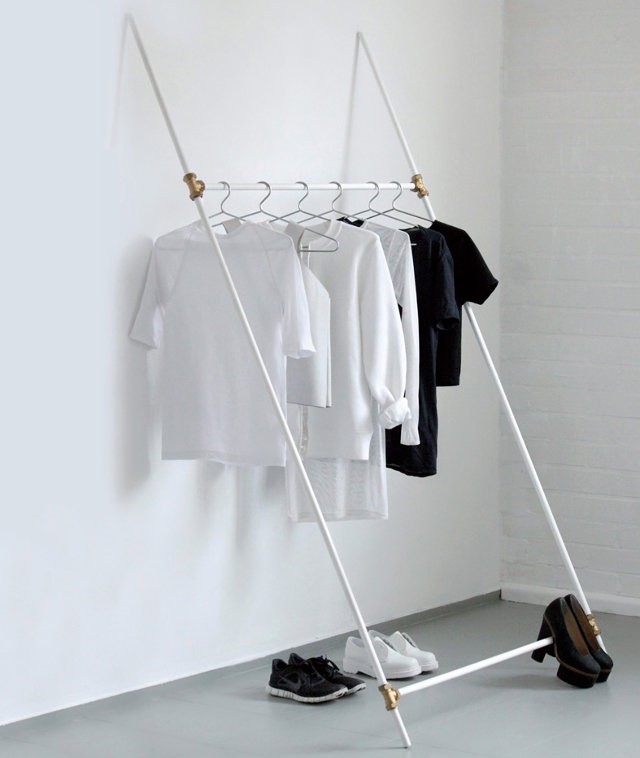 Osnova stojala za obleke Love Aesthetics so vodovodne cevi in nekaj veznih členov zanje. Dizajn je preprost, a še bolj preprosta je izdelava. 4 ceni (dveh različnih dolžin), 4 členi in minimalno ročnih spretnosti.