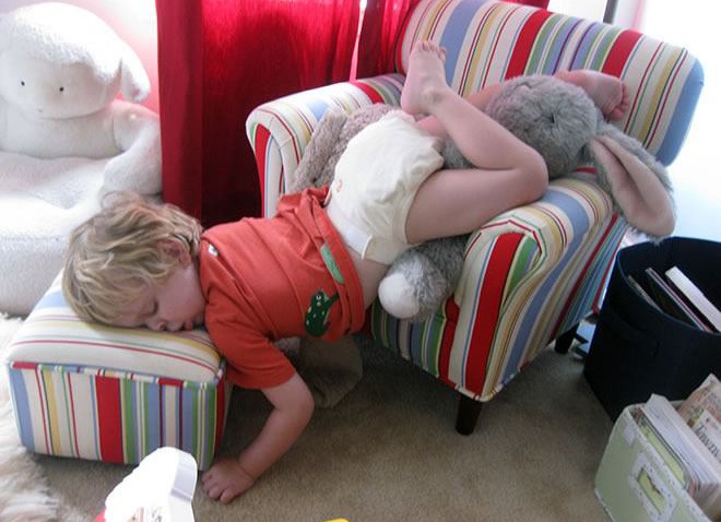 Bodisi je kriva kratka noč, dolg izlet ali splet drugih okoliščin. Otrok ni mar. Oni lahko zaspijo kjerkoli in kadarkoli. Pa če so ravno sredi kakanja ali lulanja, kosila, plezanja po televiziji ali hoje po stopnicah. Ko pokličejo iz dežele Nije, pač moraš iti.