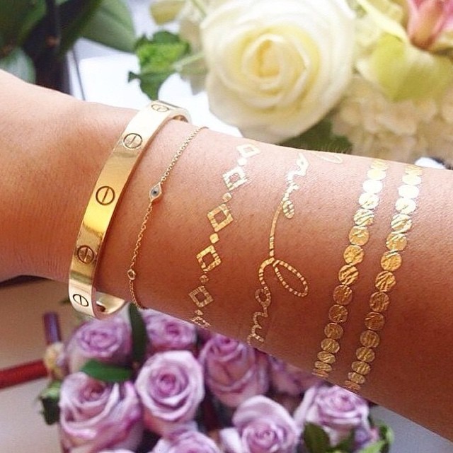 Nejnovější beauty trendy velí, že je čas na „body art“ neboli takzvaná dočasná tetování, která letos září obzvlášť ve zlaté barvě, ale samozřejmě můžeme vyzkoušet i jiné metalické odstíny. Flash tetování přicházejí v různých geometrických tvarech a dodávají naší pokožce jiskru svým leskem. Mohou mít podobu náramků, řetízků nebo jiných libovolných tvarů, ale určitě jen posílí náš styl a budeme vypadat elegantně celé léto.