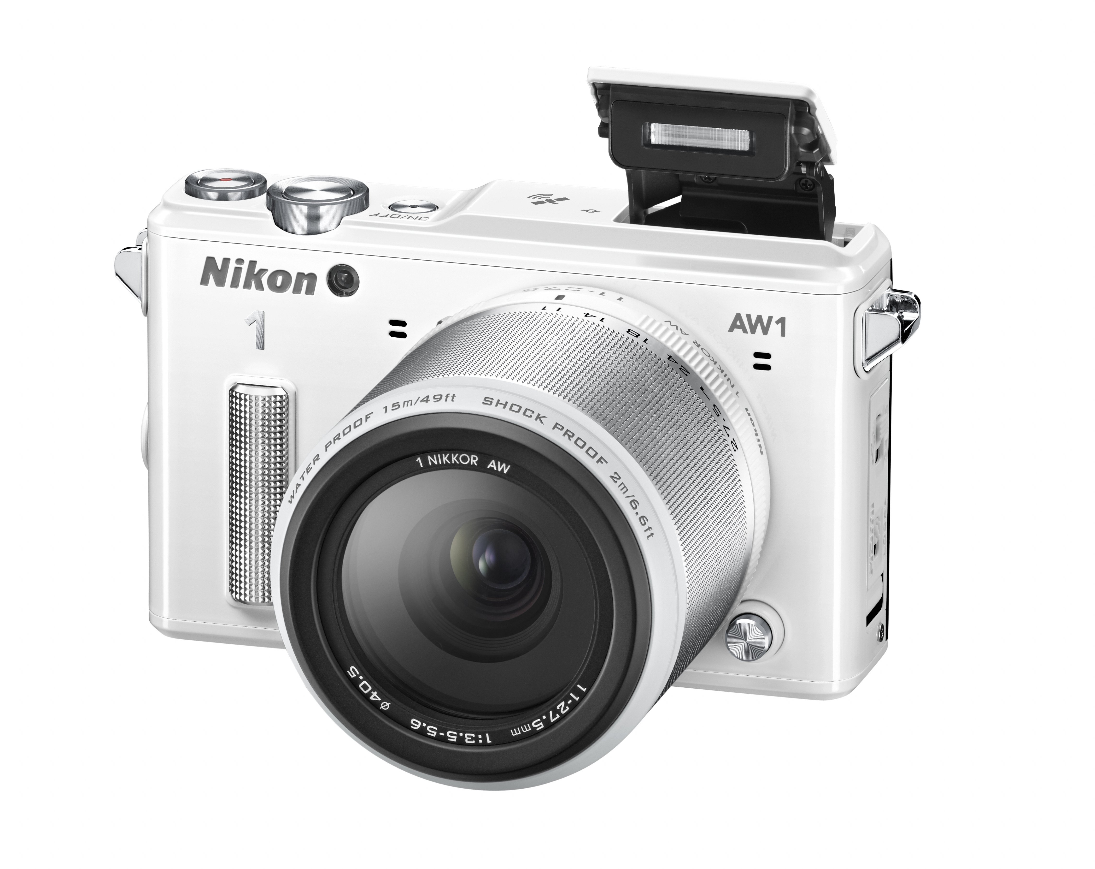 Nikon 1 AW1 - umožní vám snadno ponechat zařízení na písečné pláži ortopedickým madlům, skočit s ním do domácího bazénu nebo jej nechat kdekoli bez ochrany. Jde o celosvětovou novinku – první fotoaparát s výměnným objektivem, který je odolný vůči prachu, vodě a pádům z výšky až „několika“ metrů. Kamera je standardně vybavena dvěma objektivy – 11-27,5 mm f/3,5-5,6 a širokoúhlý objektiv 10mm f/2.8 objektiv. Oba jsou přirozeně voděodolné. Ostatní funkce jsou stejně skvělé jako to je 14megapixelový snímač s HD video možnosti, stejně jako další příslušenství – ve výšcer, GPS, hloubkoměr a kompas.