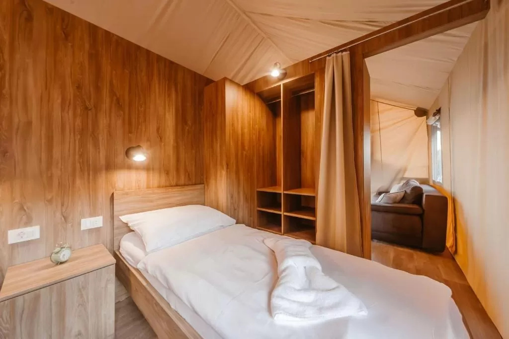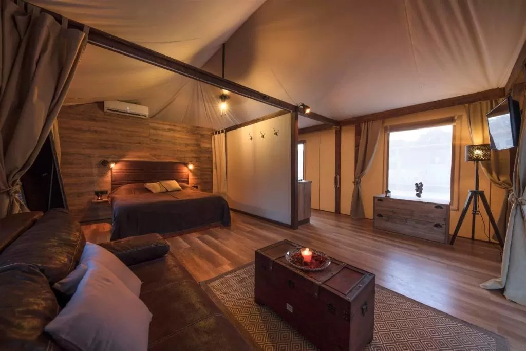 Na jedné straně glamping nabízí robinsonská dovolenáa ve druhém patře mají hosté přístup do plně vybavené kuchyně s toustovačem a lednicí a pohodlné koupelny. Ve stanu je také satelitní televize a pokud chcete mít aktuální informace o dění na dovolené, můžete se připojit i k bezplatné WiFi.