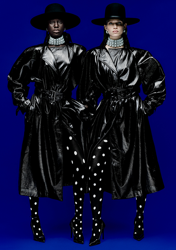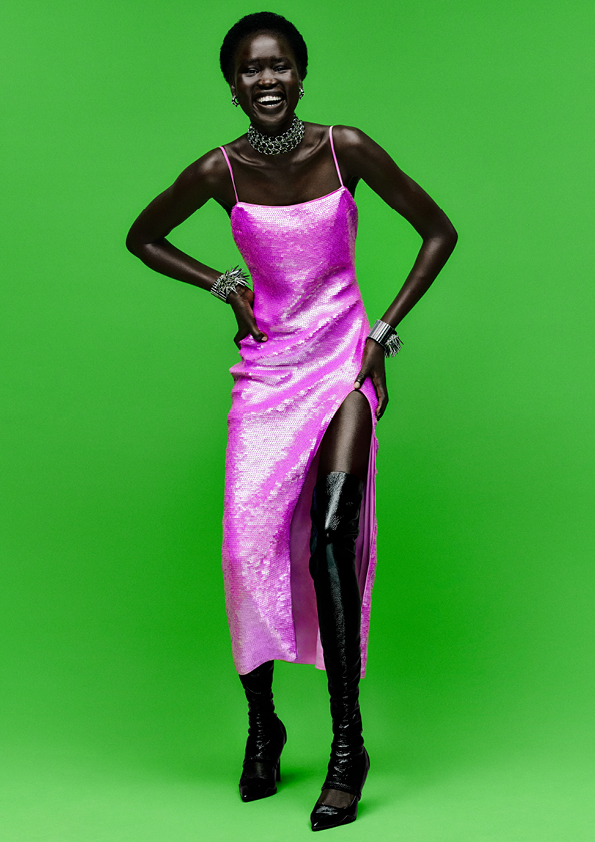 Nic není zřejmé ani očekávané; zde jsou flitrové kalhoty střižené z černé látky s průhledným zdobením navrchu, které dodává okouzlující iluzi stříbra. Třpytivé topy jsou vyrobeny z recyklovaného polyesteru a čiré recyklované nitě. Pokud jde o zakázkové krejčovství, hlavní důraz je kladen na experimentování; bundy se kombinují s šortkami nebo mají úhlový výstřih vzadu, který umožňuje prosvítat výrazné potisky nebo třpytivé korálky vest.