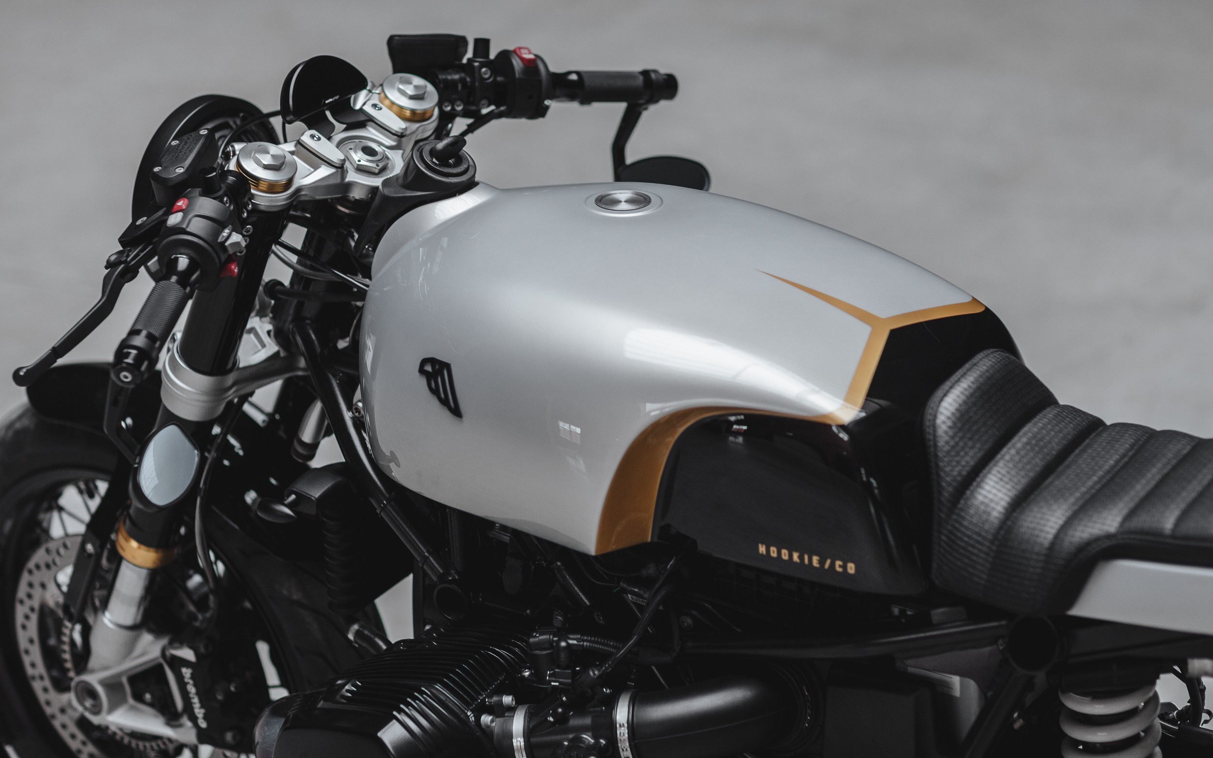 Deli, kot so sedež, posoda za gorivo in zadnji konec motorja, so v celoti narejeni ročno iz aluminija. Hkrati je bil to první projekt, pri katerem so pri Hookie/Co uporabili ta zahteven material, slike pa dokazujejo, da jim je to več kot uspelo. Celo nosilec črpalke za gorivo je narejen iz aluminija, da se skladno poda preostalim delom motornega kolesa. Po ogrodju so namestili še instrumentno ploščo Motogadget Motoscope, ABM-ove krmilne podaljške in močan LED-žaromet. Platiščem so nataknili pnevmatike Pirelli Angel GT in obarvali motorno kolo v srebrno barvo s zlatimi poudarki. Od originalnega BMW-ja je ostala večina vitální sestavnih delov, kot so motor, vzmetenje in ogrodje. Falcon je tako še en dokaz, da je lahko že tako přitažlivý BMW R nineT še bolj zanimiv.