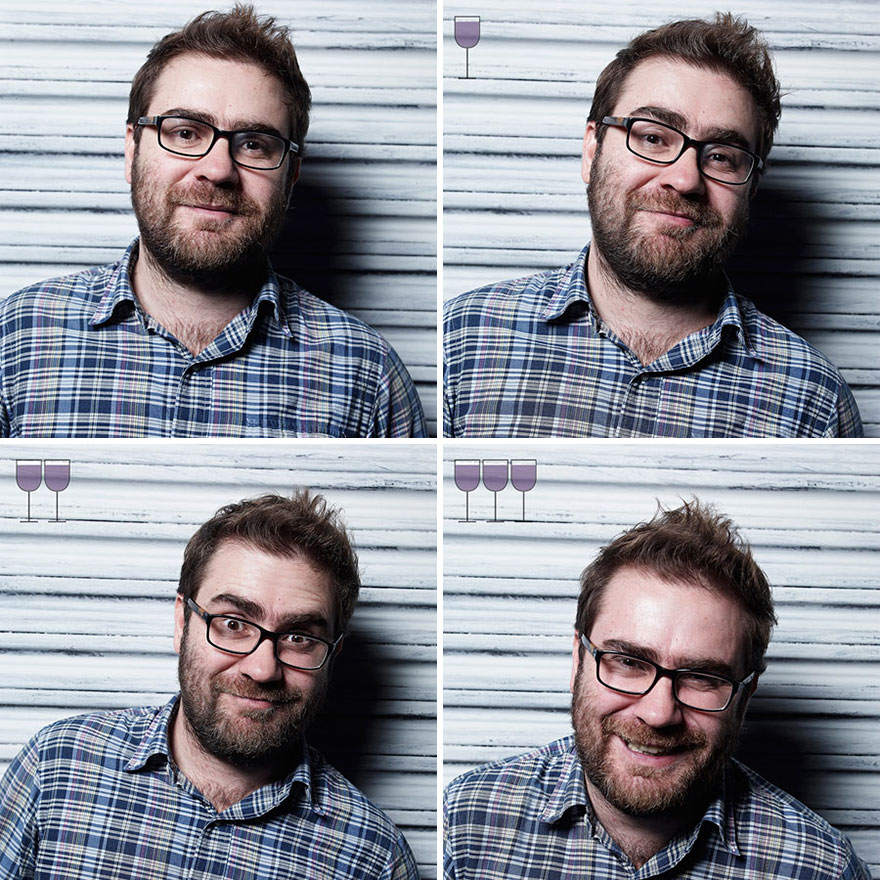 Vse fotografije so pristne in so nastale spontánně. Prva fotografija je bila posnetka takoj za tem, ko so ljudje stopili pred objektiv, in zaobjema stanje po napornem in stresnem delovnem dnevu. Vsi kasnejši posnetki pa razkrivajo, kaj se s človekom dogaja po vsakem nadaljnjem popitem kozarcu vina.