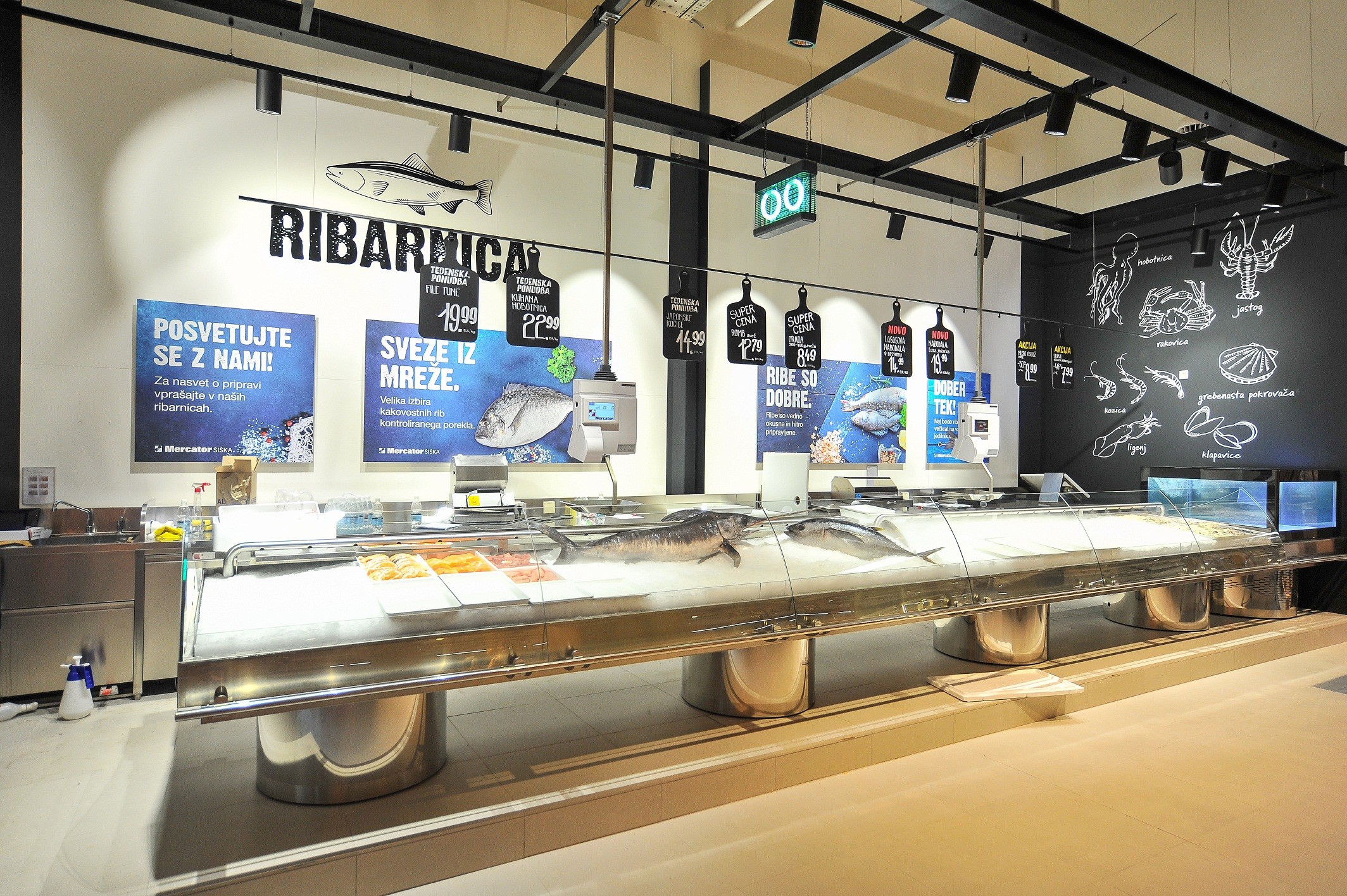 Cukrářské výrobky budou prodávat prodejci připraveno a vyzdobeno dle přání zákazníka a před zákazníky. Rybí trh je také větší a modernější a nabízí velký výběr čerstvých i mražených ryb, které jsou doručovány denně. Spotřebitelé budou také moci oddělení s mezinárodní specializací, kde se budou konat kuchařské akce a ochutnávkyI přes zrekonstruovaný obchod zůstává Mercator věrný sortimentu produktů a produktů od domácích dodavatelů, protože lokální potraviny jsou prezentovány ve speciální sekci. Z domovských míst se speciálními policemi Milujeme domácíK dispozici jsou také dávkovač vína a olejeU vchodu do obchodu je také roh, který připomíná stánek na trhu, kde budou k dispozici čerstvé produkty, zejména ovoce a zelenina. U vchodu jsou také květinářství a informační pult s tabákovým a novinovým stánkem, kde si můžete také posedět a přečíst si noviny, a zároveň nabít mobilní telefon.