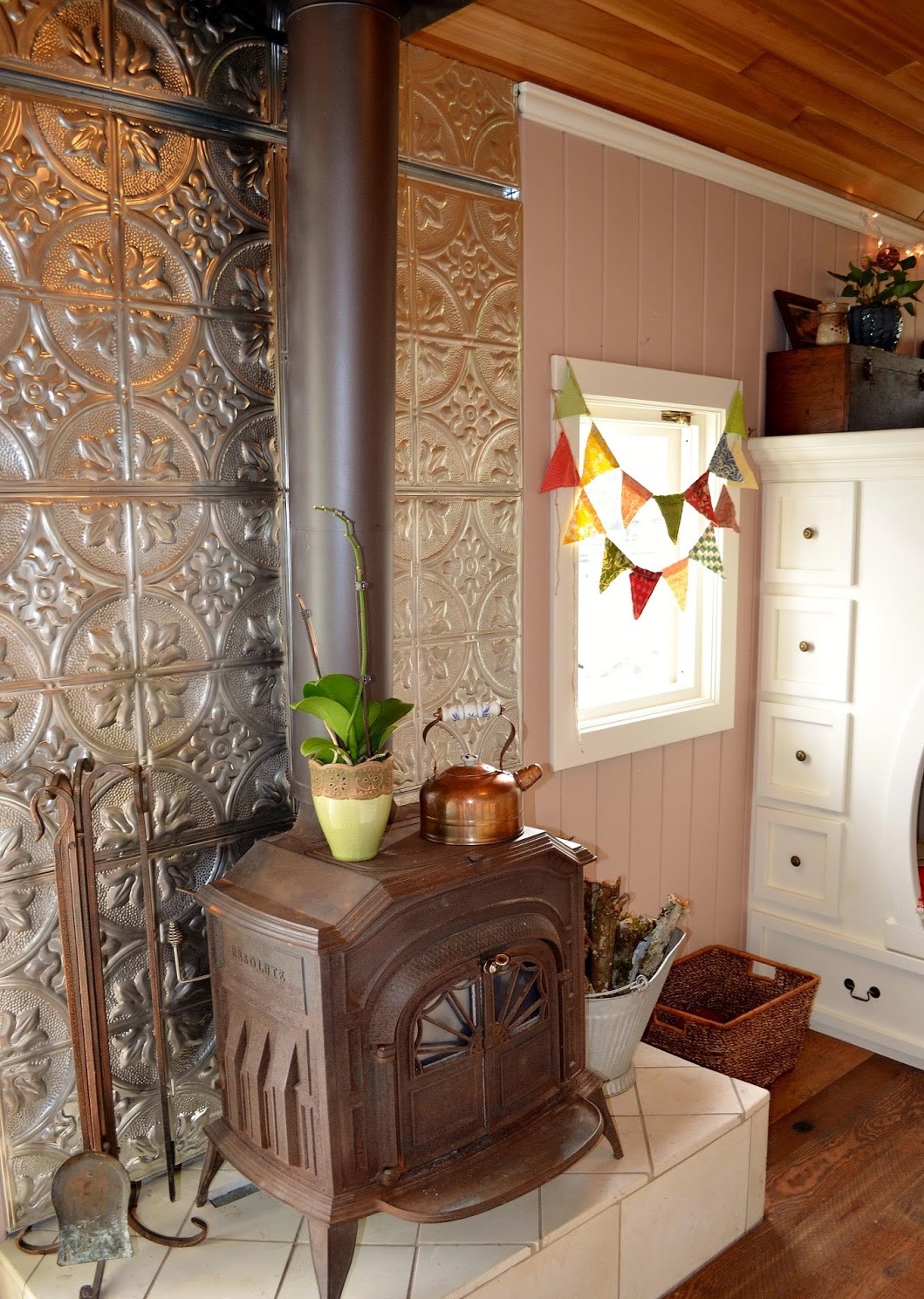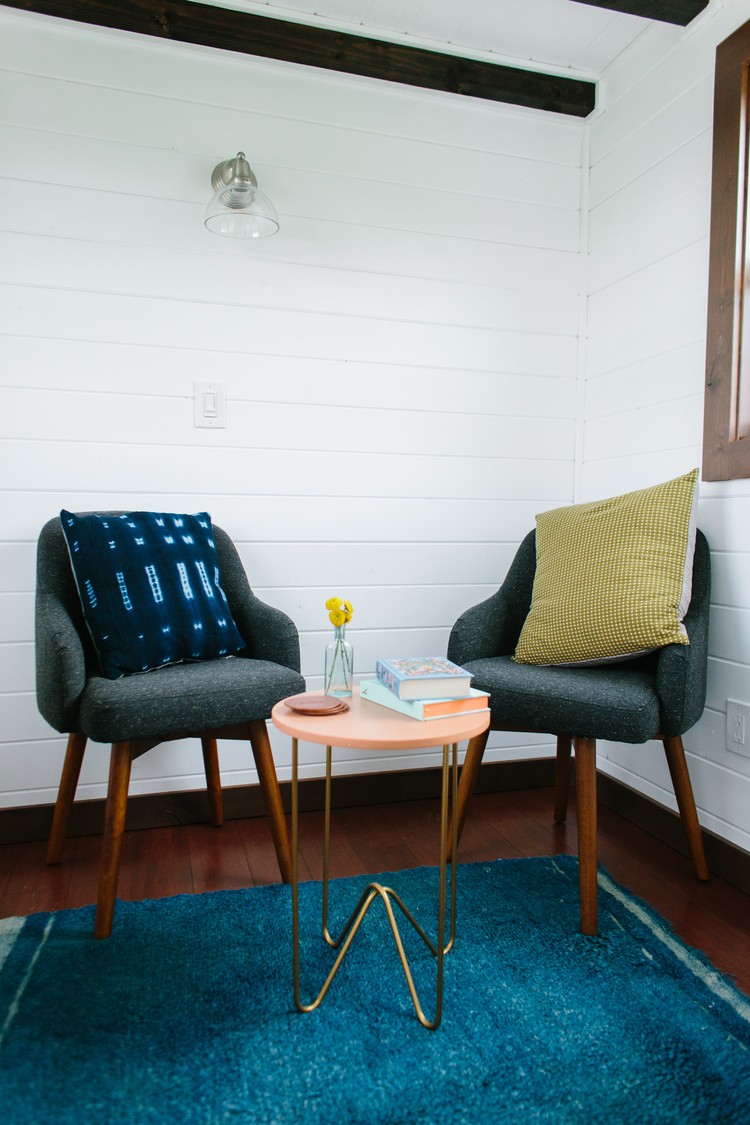 Eklektična mešanica dekorja ustvarja edinstven videz v tej drobni hiši na kolesih. Nevtralni kavč nevtralizira prostor in omogoča, da zasijejo rdeče okrasje in umetniška dela.