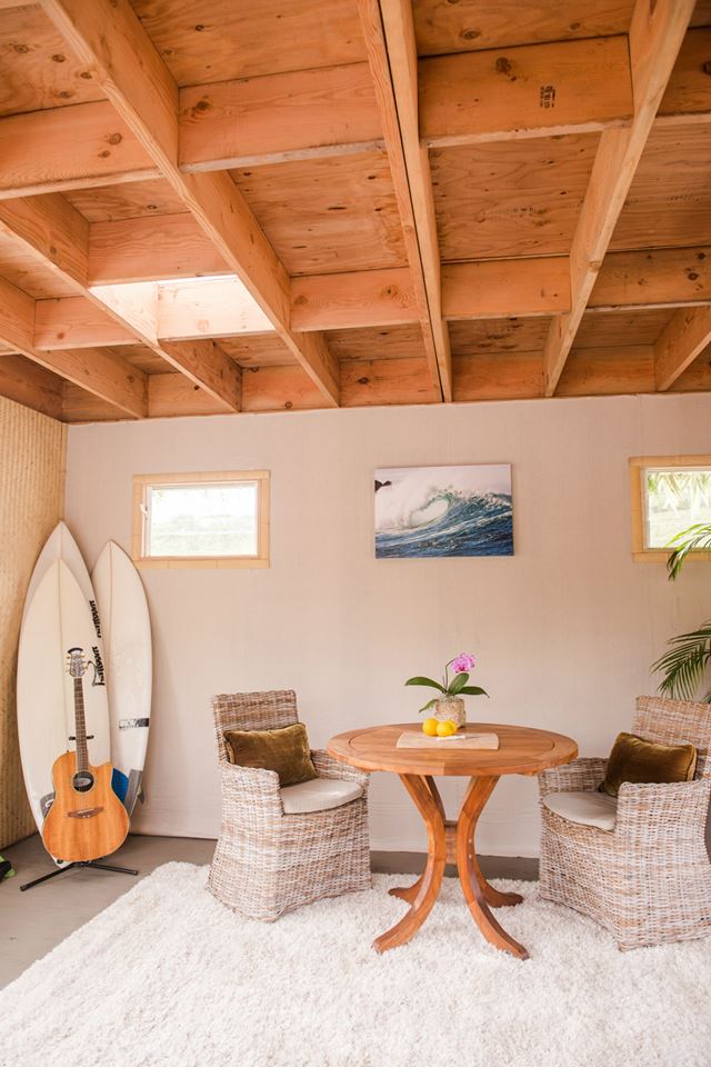 Streha s slemenom daje temu mikrodomu lahek in zračen občutek. Izbrani dekor, kot sta rjavi usnjeni kavč in kot mozaik tkana preproga, ohranja videz sodobnosti in v prostor vnaša toploto.