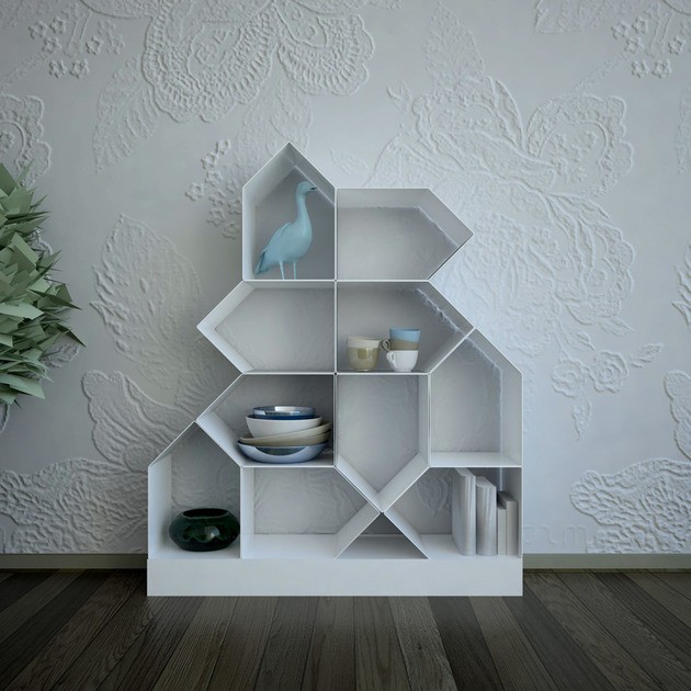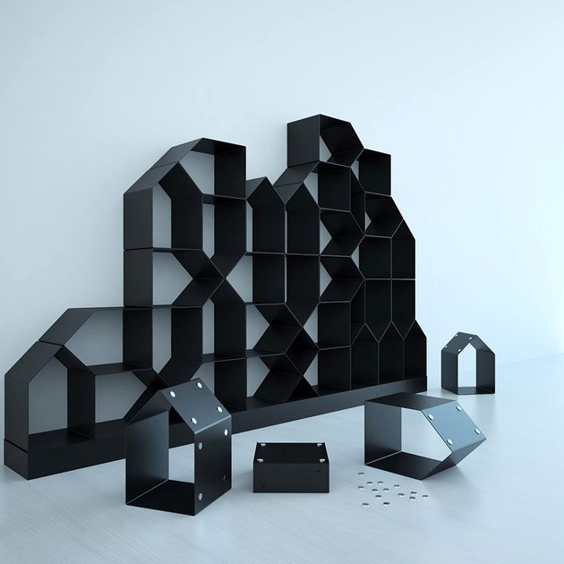 Zvláštností kompozice je modulární tvary, které nejsou čtyřúhelníkové. Navzdory trojúhelníkovému tvaru na jednom konci se moduly jednoduše a snadno skládají pomocí malých neviditelných šroubů. magnetykteré drží kompozici pohromadě. K prodyšnosti přispívá i použitý speciální materiál, extrémně tenké železo, které je přesto odolné. Je moderní, městský kus nábytku, který nabízí četné možnosti prostorového uspořádání.