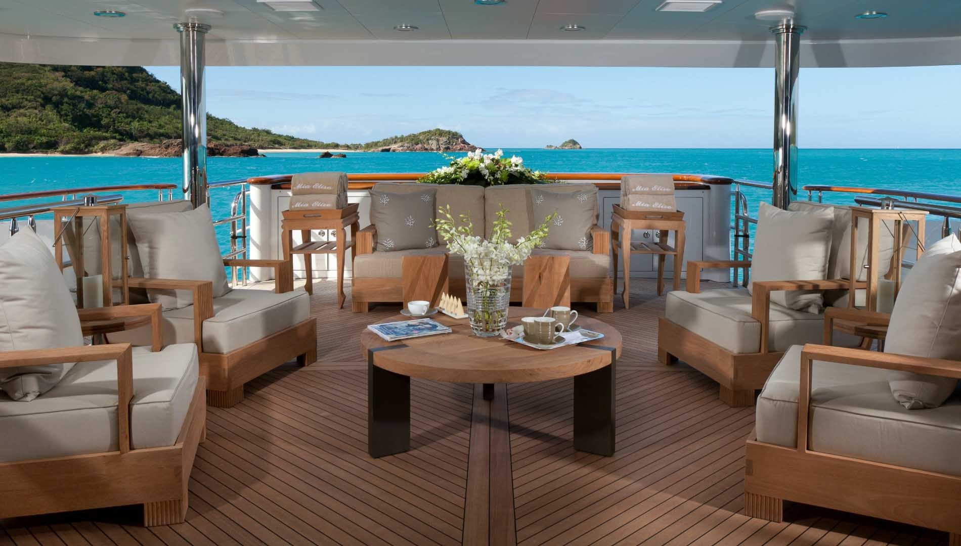Jahta Mia Elise je bila izdelana v letu 2010 z oblikovalsko vizijo korporacije Trinity Yachts. Je naravnost ustvarjena za navtične entuziaste. Vključuje žiroskopske stabilizatorje, ki omogočajo udobno čezoceansko križarjenje. Notranjost je zasnoval Patrick Knowles in predstavlja neskončno mero elegance.