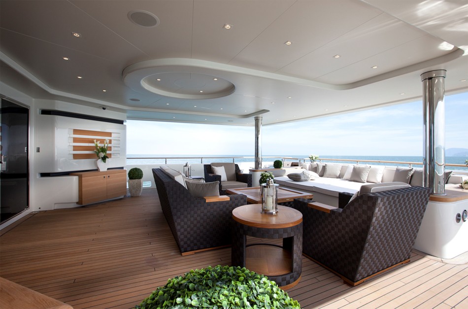 Ja, cena je morda malce zasoljena, a ob toliko soli, ki jo obdaja, je bilo to za pričakovati. J’ade je kot kenguru, saj v svojem trebuhu pestuje 8-metrskega ”otročička”, luksuzni gliser Riva Iseo, ki pa ne počiva na suhem, ampak znotraj nje plava kot v mirnem pristanu. Garáž se lahko v le tři minuty změnit plavecký bazén s podvodnimi lučmi, ki ga obdaja bar, medtem ko se zadek lahko spremeni v teraso za sončenje in koristi taisti šank. Mimogrede. Ob desetih gostih lahko ladja gosti še 13 članov posadke.