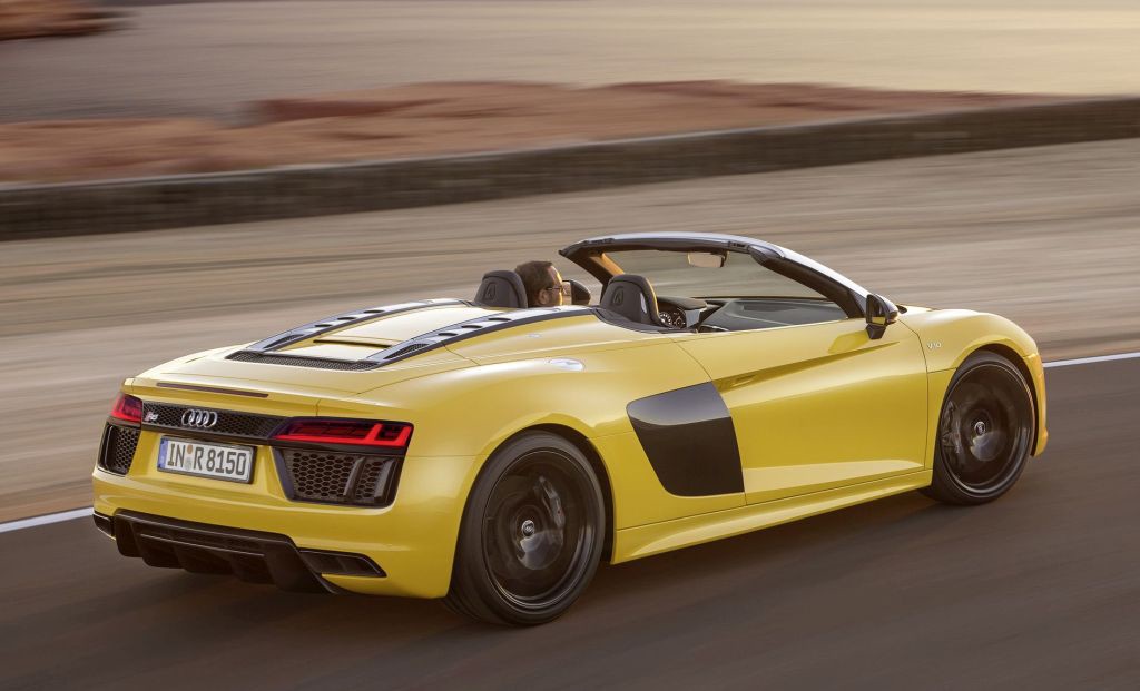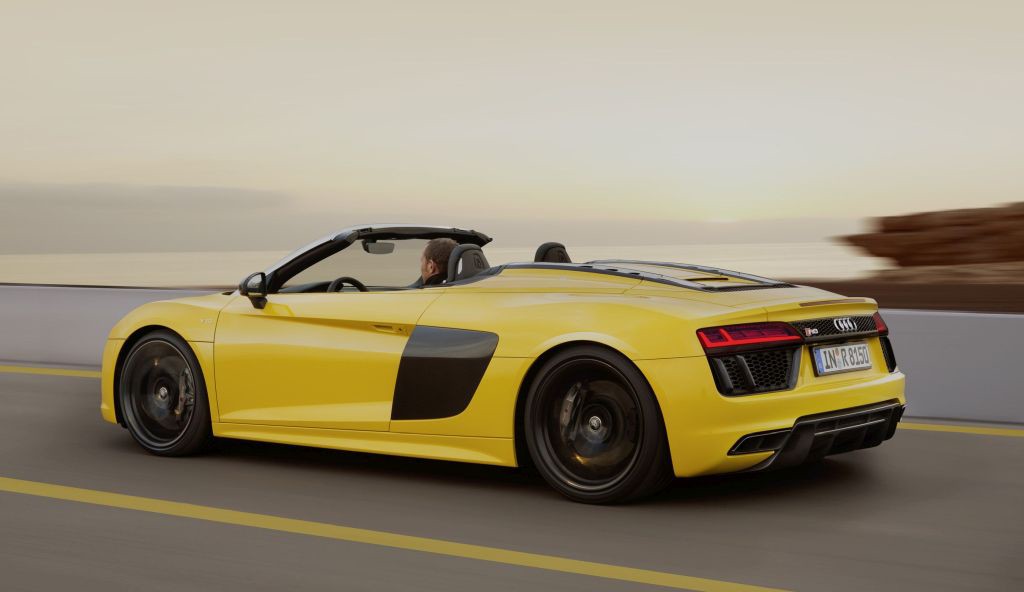 Nováčci Audi R8 Spyder V10 žena se nachází v centru atmosférický 5,2litrový motor FSI s dvojitým vstřikováním, který dynamicky reaguje na polohu plynového pedálu. Drnčivý zvuk motoru umocňuje sportovní výfukový systém vytvářející vysokooktanové symfonie hodné Beethovena. S mocí 540 hp (397 kW) a s točivým momentem 540 Nm při 6500 otáčkách za minutu dokáže zrychlit 3,6 sekundy až 100 km/h. Jako kryt používá světlo plátěná střecha s elektrohydraulickým pohonem, který se do rychlosti 50 km/h otevírá a zavírá za 20 sekund. Zadní okno lze zvednout a stáhnout, ale pokud jsou všechna okna nahoře, víření větru nad karoserií je výrazně menší. Spotřeba paliva je také nižší ve srovnání s předchůdcem, konkrétně o 10 procent (11,7 litru na 100 km, 277 gramů emisí CO2 na kilometr).