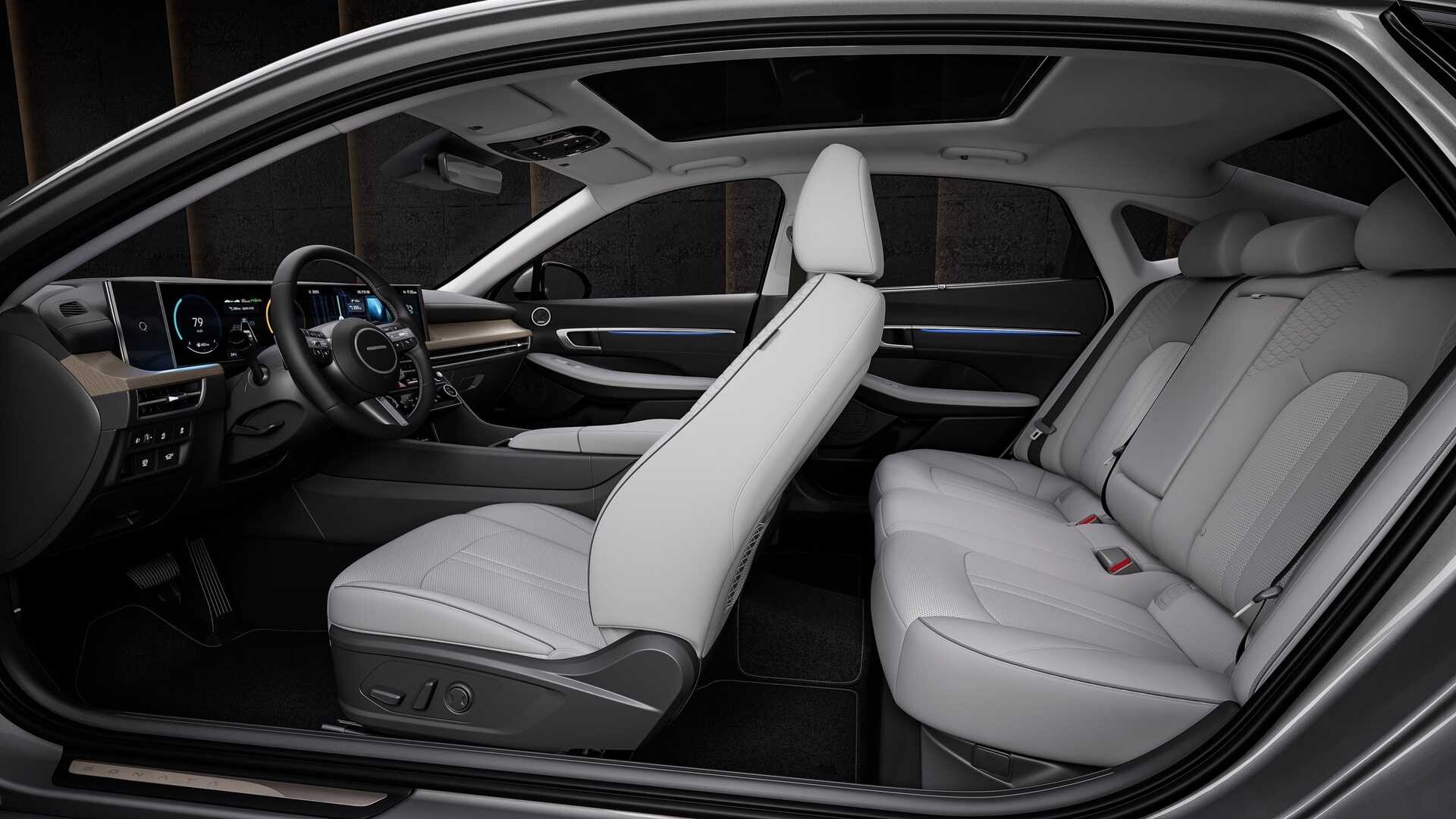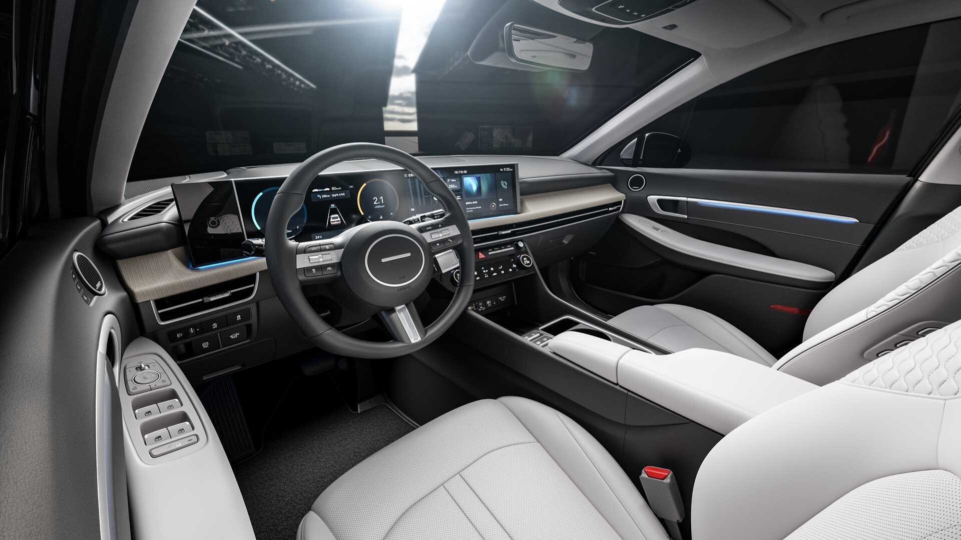 Přesuneme-li se do interiéru, Sonata 2024 přináší významné změny do kabiny a stává se prvním modelem Hyundai vybaveným sofistikovaným zakřiveným displejem připomínajícím BMW iDrive 8. 12,3palcový (přibližně 31 cm) digitální přístrojový štít a obrazovka infotainmentu na touch stejné velikosti jsou hladce integrovány do jediného zakřiveného skleněného panelu. Zatímco BMW opustilo zkratky pro ovládání klimatizace, Hyundai si ponechal vyhrazený panel HVAC, ale nyní má ovládání citlivé na dotyk.