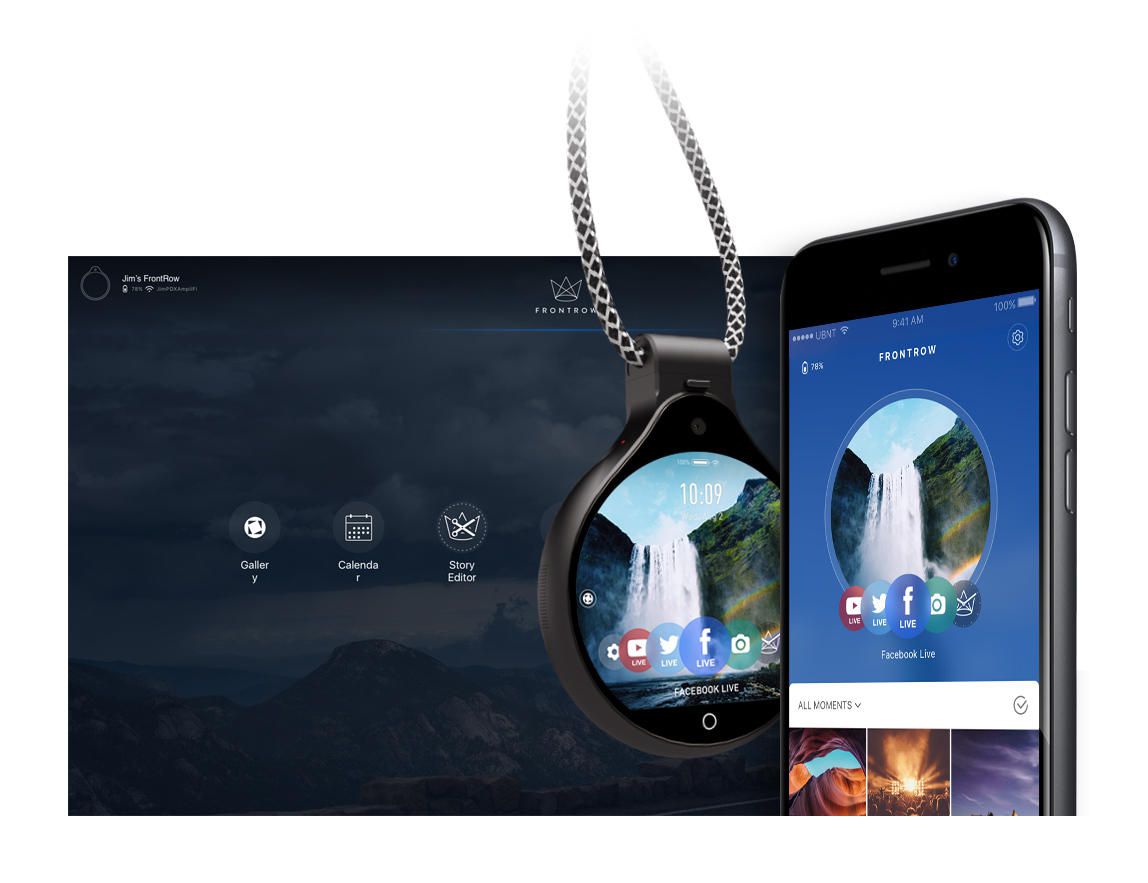 Nejprve se podíváme dovnitř zařízení. Pohání ji to Procesor Snapdragon 625, a budou se starat o rychlost provozu 2 gigabajty paměti. Pro uložení dat by to mělo stačit 32 gigabajtů prostoru, bez možnosti přidání kapacity pomocí microSD karty. Baterie vydrží 2 hodiny v provozu živý přenos respektive 16 hodin v režimu příběhu. Navigaci budete moci ovládat 1,96palcový LCD displej s rozlišením 640 x 572. FrontRow je vybaven dvěma kamerami. Ten hlavní má 8 milionů bodů a Objektiv 148 stupňůa na přední straně máme kameru s 5 milionů bodů. Oba nahrávají videa v rozlišení 1080p při 30 snímků za sekundu. FrontRow zahrne vaše akce živě přenášeny na sociálních sítích Facebook, YouTube nebo Twitter. Kamera má také funkci Story Mode, která bude pořizovat fotografie každé 3 až 10 sekund po celých 16 hodin. Poté fotky uspořádá do koláže a přehraje ji v jakémsi časosběrném režimu.