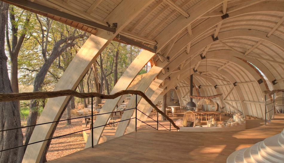 Sandiba's safari lodge Okavango nám dokazuje, že ekologická stavba z biologicky odbouratelných, udržitelných materiálů může být i luxusní. Rezidence je postavena téměř celá ze dřeva a připomíná převrácenou loď se zakřivenými borovicovými trámy.