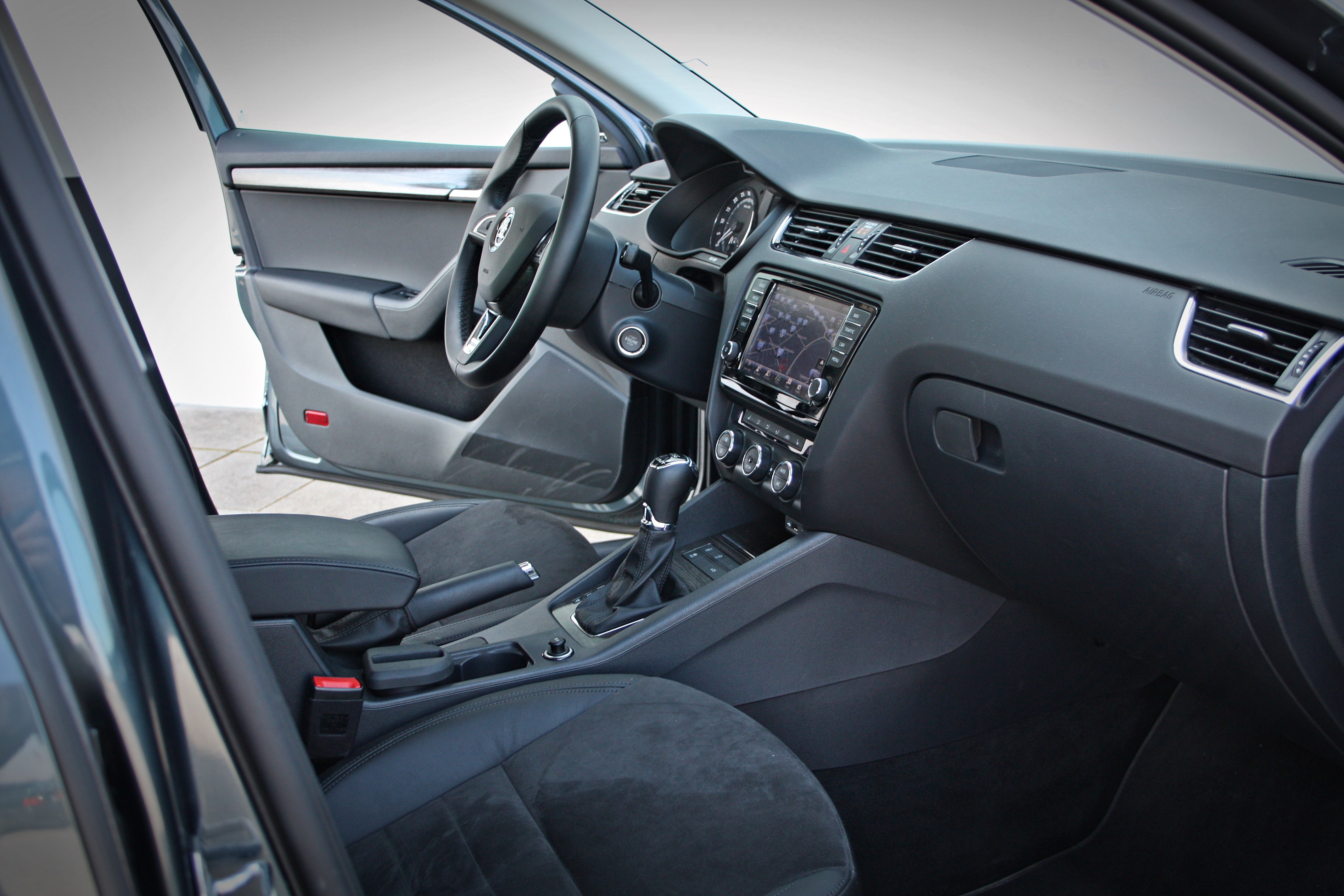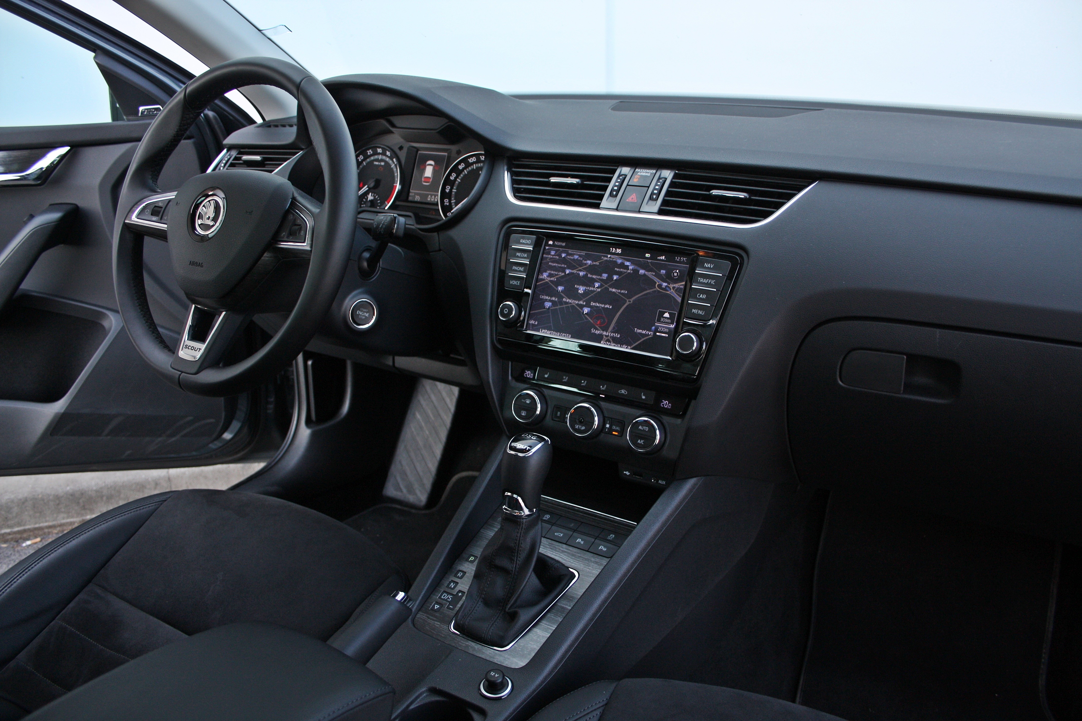Co se týče zbytku výbavy, tak je zůstávající na splátkovém kalendáři vrásky trochu. Kromě zmíněného si tester také poradil chytrý klíč a tlačítko start vozidla, jejichž uspořádání (stejně jako umělé imitace dřeva na středové konzole) stále naznačuje určitou míru úspory. Nechte se ale překvapit tím, že jsou ve výbavě vedle sebe tovární navigace a také audio systém od známého výrobce radarový tempomat a dokonce přídavné topení vozidla (známější jako webasto). V podstatě byl tester přemožen kožené čalounění (kombinace alcantary a kůže), trackovatelná bi-xenonová světla a elektrifikace a vyhřívání sedadel. Tím Octavia a s ní Škoda definitivně rázně vkročila do business segmentu, ale zároveň vyvstala otázka, jaká je výsledná cena takto plně vybavené Octavie Scout.