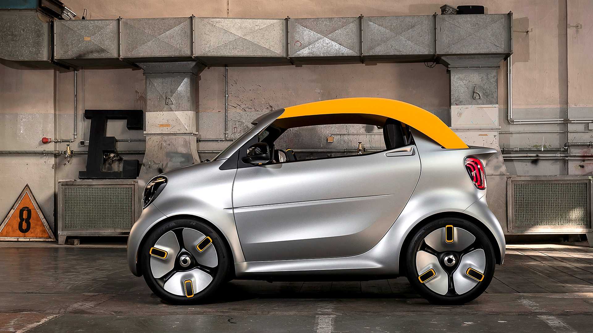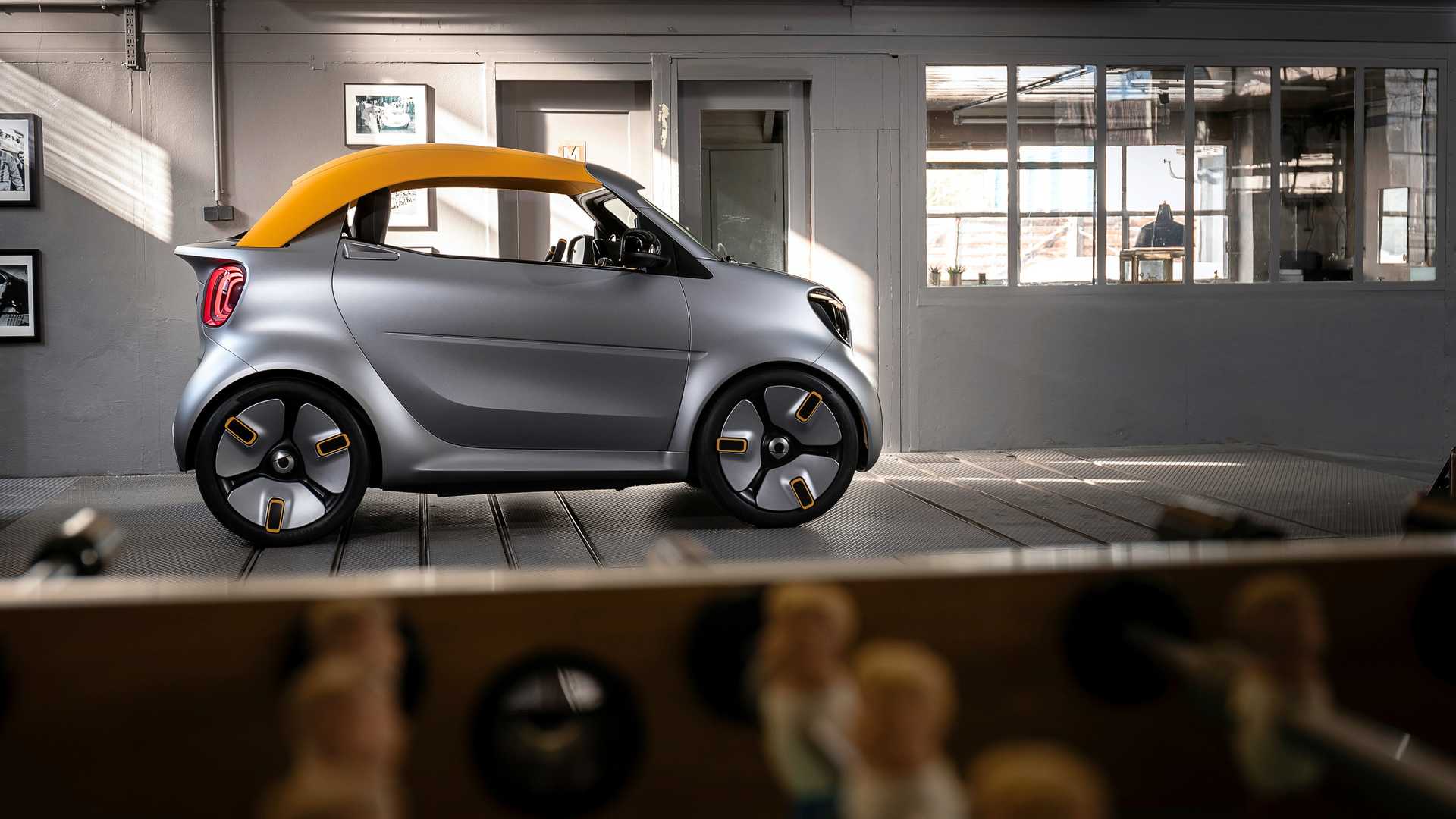 Trpežna streha živo oranžno-rumene barve ustvarja izrazito opazen kontrast s svetlejšo karoserijo v mat sivi barvi. Streha ima odprtino na zadnji strani in dve večji ob straneh, kjer ni vgrajenih stranskih stekel. S tem so oblikovalci zagotovili čisto in emocionalno doživetje vožnje, ki jo lahko enačimo z znamko smart.