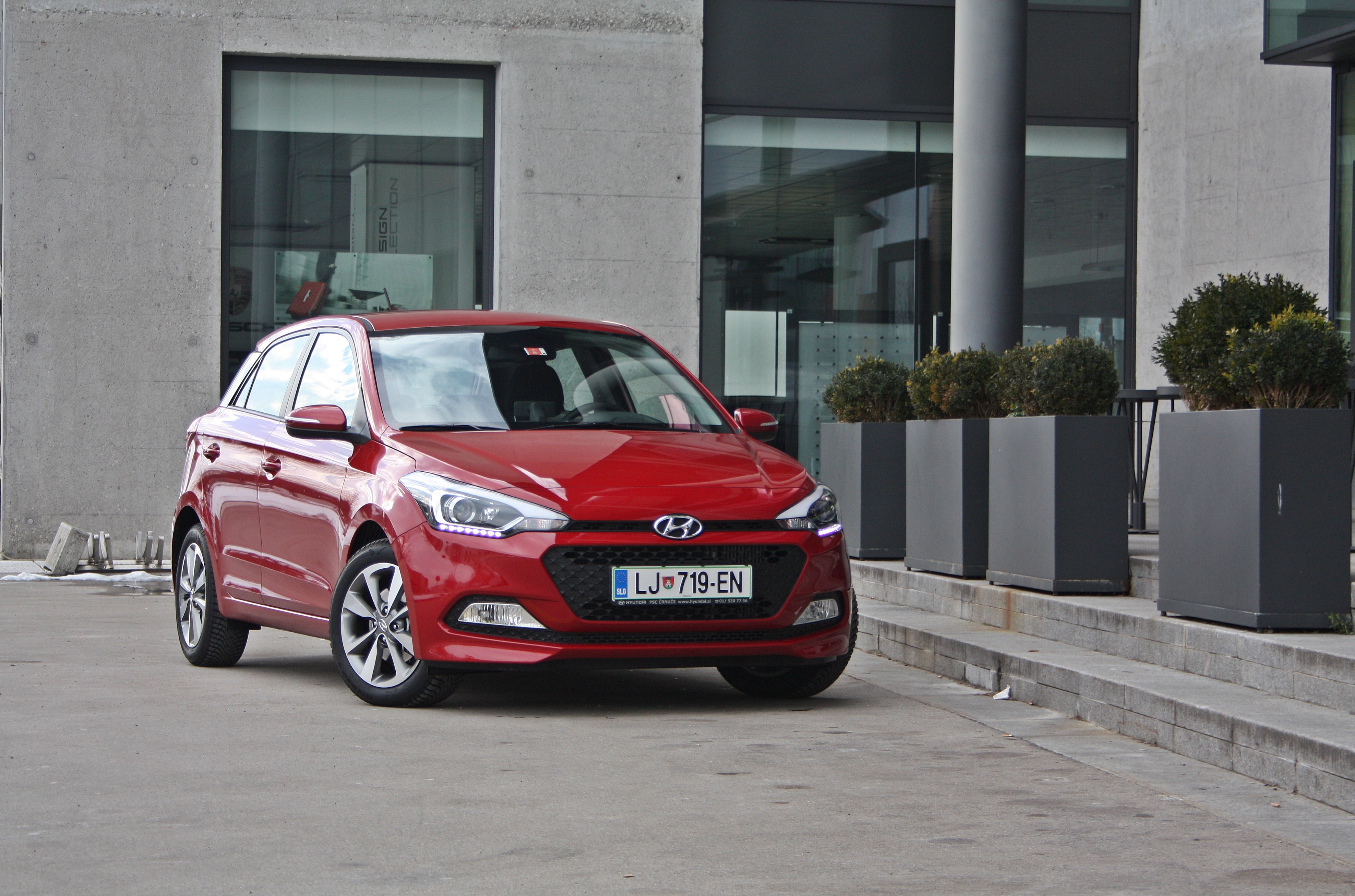 Pa začnimo na začetku. Oblikovno boste s kateregakoli kota zaman iskali podobnosti s predhodnim modelom. Teh preprosto ni. Zunanja oblika je zelo moderna in ukrojena po najnovejših evropskih smernicah. Marsikdo je uporabil tudi besedo “kopirali” so malce tega in tega…ampak mi pravimo, da je i20 dovolj svež in samosvoj, da mu plagiatorstva ne moremo očitati. Če kdo vidi kakšno podobnost z naprimer giulietto pa novi hyundai i20 prav tako ne moremo šteti v bran. Posebnost predstavlja maska motorja z izrazitimi horizontalnimi linijami in razpotegnjenimi žarometi. Lepa pika na i so všečno oblikovane LED dnevne luči, tako da na ksenon preprosto pozabiš.