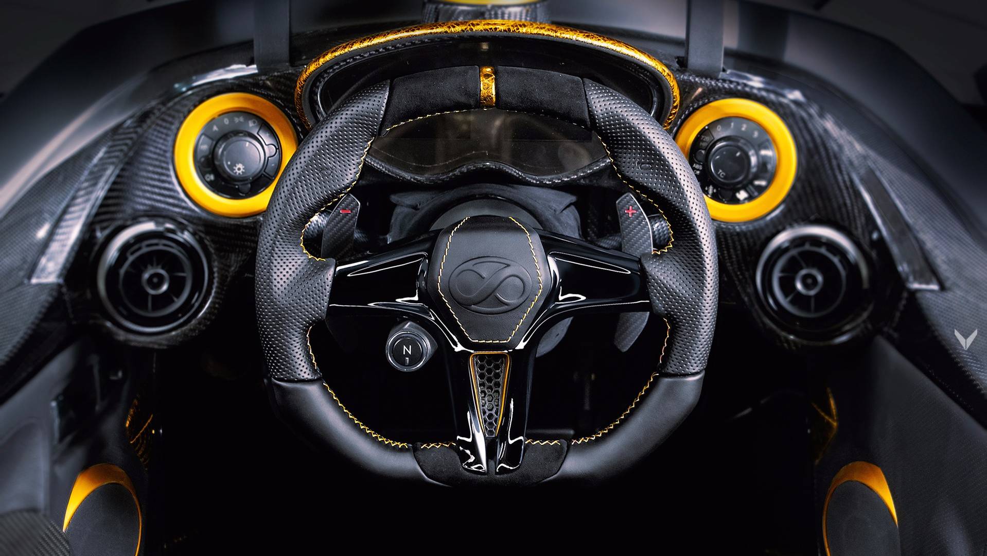 Tramontana podle Vilner je unikaten izdelek, na katerem še kako izstopa zlato-črna barvna kombinacija. Zunanjost je odeta v mat črno barvo, ki jo kontrast delajo karoserijski deli, pobarvani v zlatá barva. A notranjost je tista, kjer ta barvna kombinacija resnično pride do izraza. Notranjost je Vilner popolnoma predelal in je odel volanski obroč, armaturno ploščo, vratne obloge a dokonce varnostne pasove v bleščečo zlatá barva. Poleg zlata imam v notranjosti še usnje in alkantaro, ki ima zlate šive, da se ujema z ostalo zlato barvno kombinacijo.